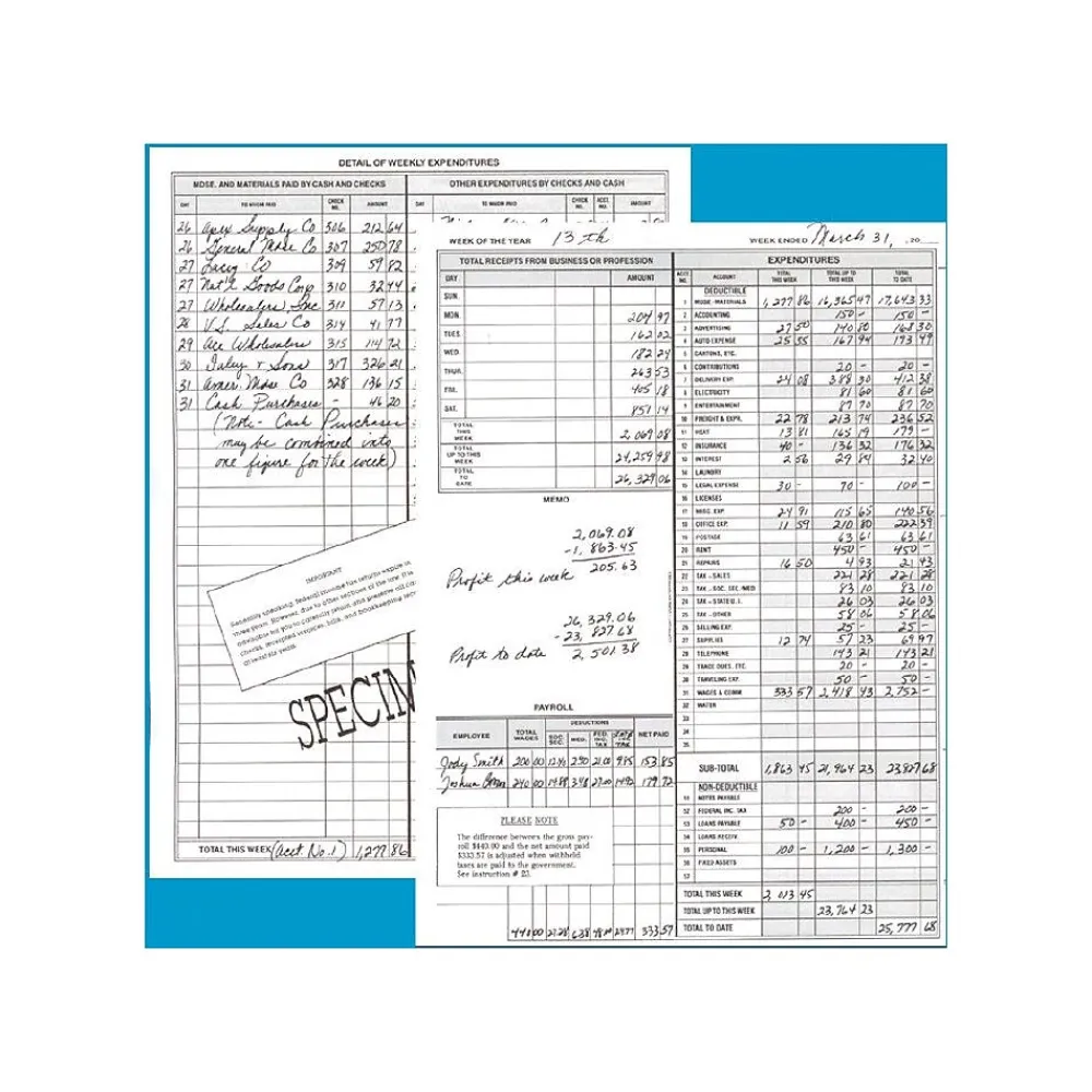- Contains payroll section, calendar of tax forms, complete specimen page