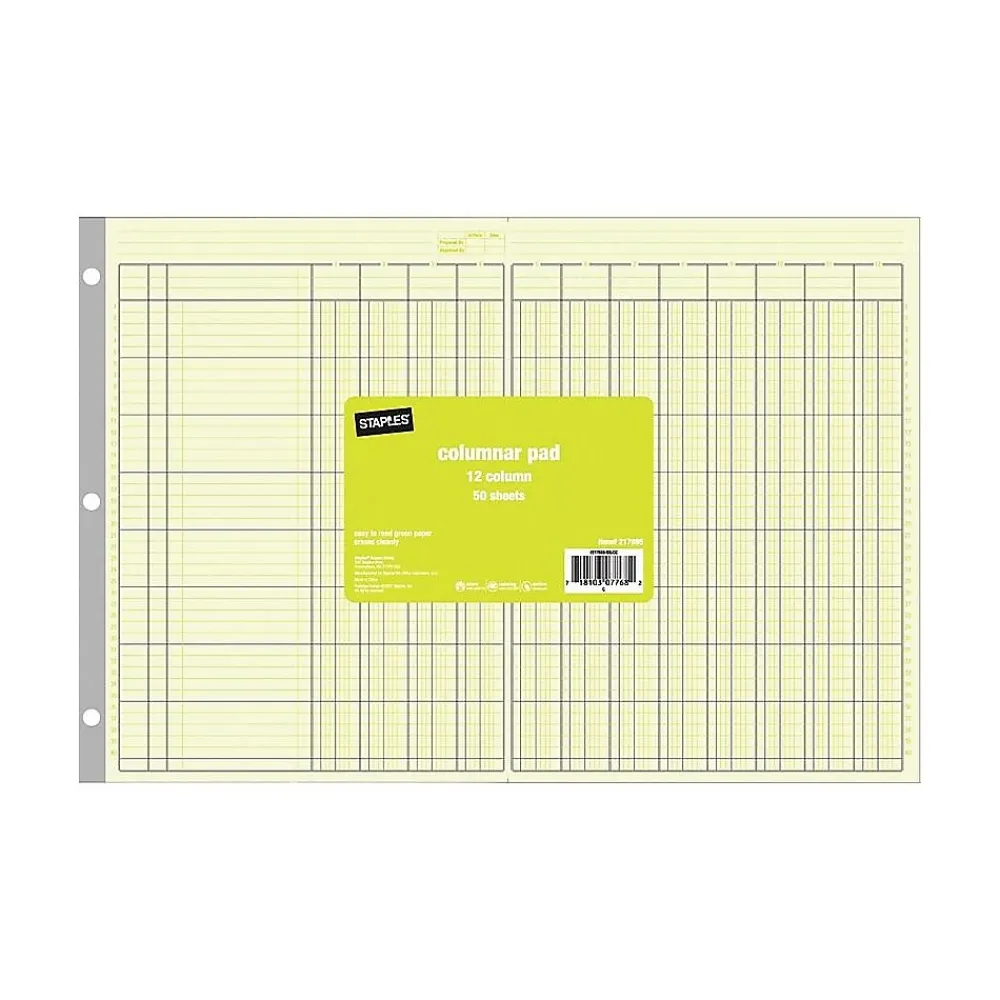 Make financial data and other records easy to read and write with this 12-column columnar book. The edge is three-hole punched, so you can conveniently store it in standard three-ring binders, while the 12 columns help you organize data. This Staples columnar book is tinted green to help reduce eyestrain while promoting readability, and it has 50 sheets to provide plenty of room.