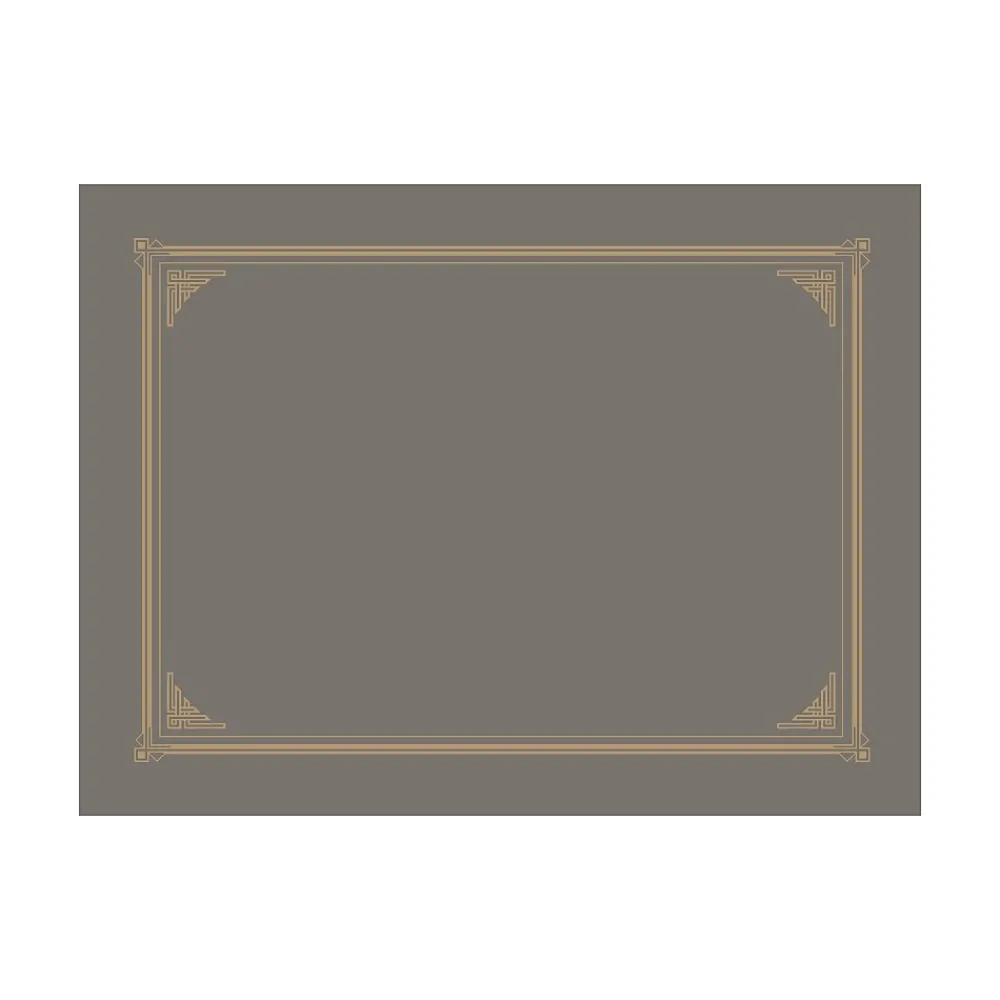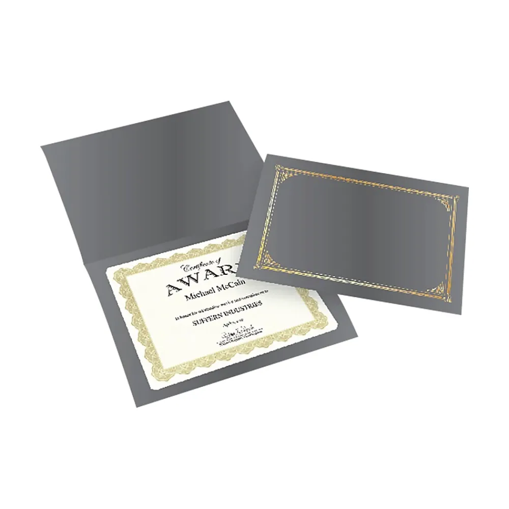Keep awards and certificates free of crinkles and safe from water damage with these document covers. The 80 lb. classic linen paper makes awards look and feel official, while the gray color and gold foil border make these document covers look professional. These Geographics Classic Linen gray and gold foil document covers prevent photos, documents and award certificates from bending and ripping in transit.