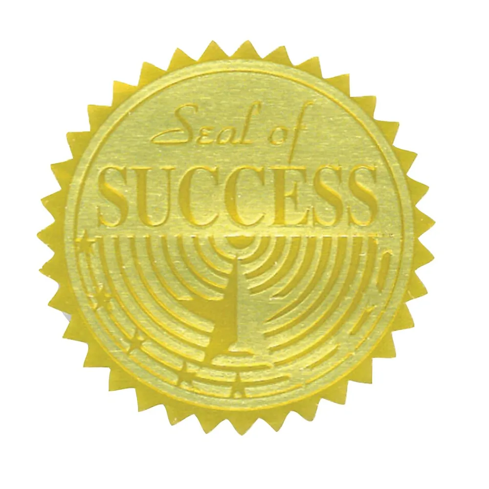 Seal of Success Gold Foil Embossed Certificate Seals are gold foil embossed certificate seals add an extra touch of class to any certificate, award or diploma! Embossed with Seal of Success resting on top of a field of stars for that special day. Also great for prizes and bulletin boards. Measures 1 3/4″ diameter. Each pack contains 54 self-adhesive seals.