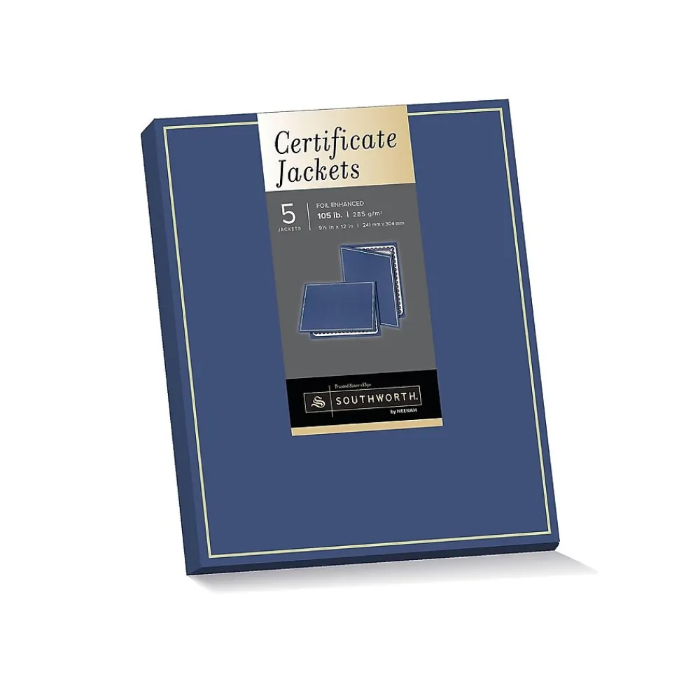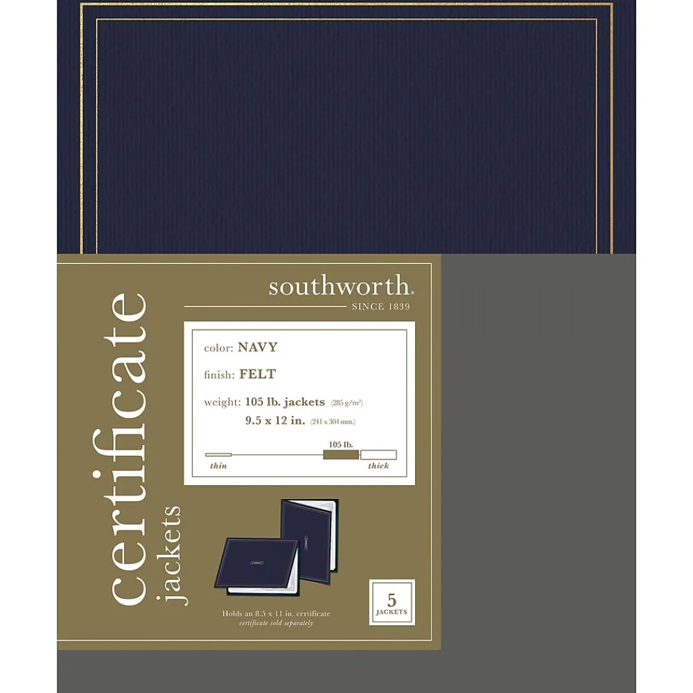 Present achievement documents in an attractive way with these acid-free fold-over certificate jackets. The felt finish and foil enhancements add sophistication to these presentation jackets, and the sturdy 88 pound paper weight card stock backing helps prevent accidental bending and folding. This 5-pack of Southworth certificate holders helps you maintain a consistent look when distributing awards.