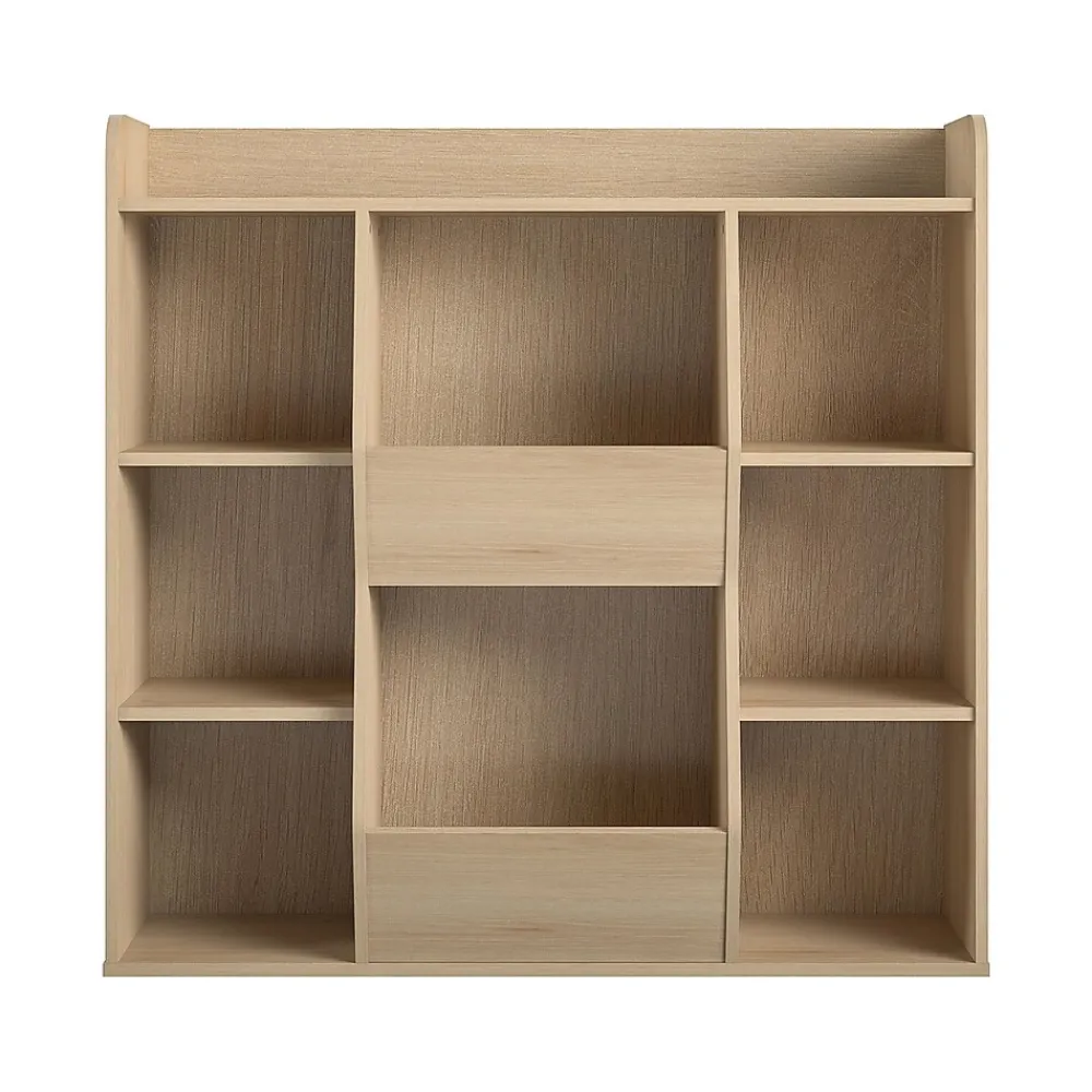 - Large kids’ toy storage bookcase made of particleboard in a blonde oak finish