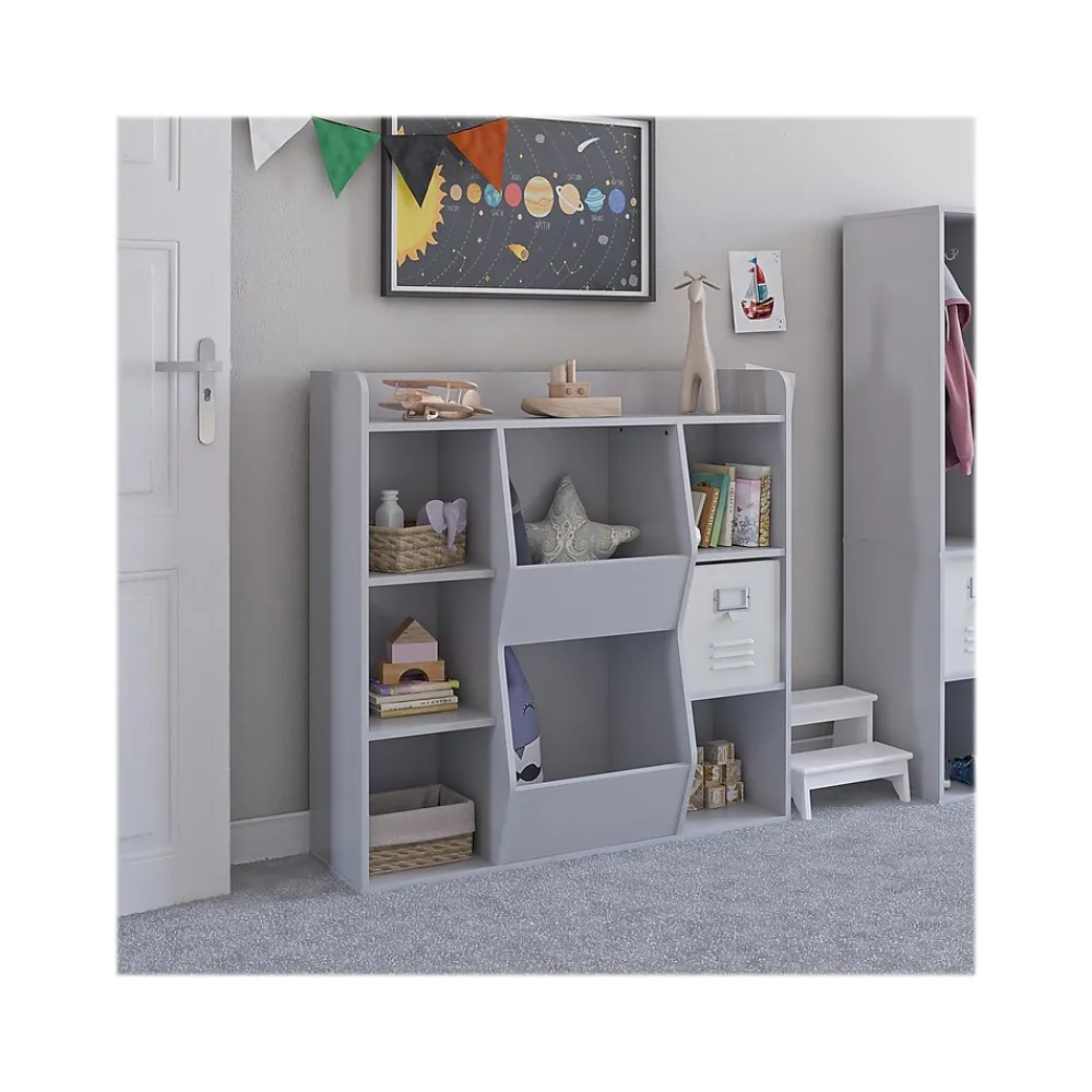 - Large kids’ toy storage bookcase made of particleboard in a dove gray finish