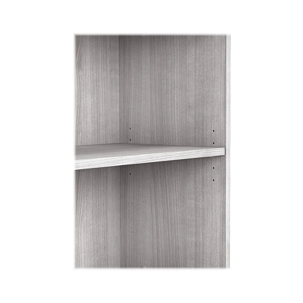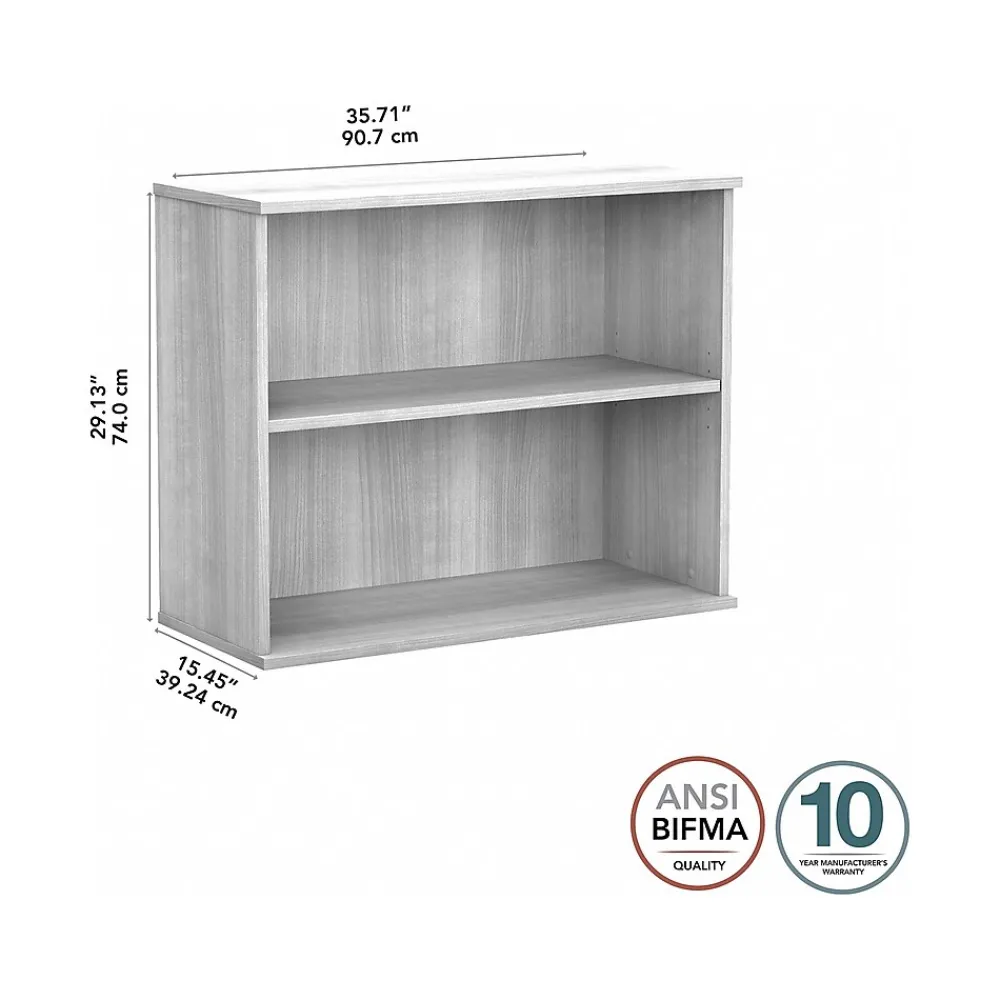 The Bush Business Furniture Hybrid small two-shelf bookcase offers a stylish, long-lasting storage and display solution for the modern professional. Organize books and other reference materials, or give your workspace a personal touch with pictures and decorations on shelves that support up to 50 lbs. each. One shelf is fixed for stability, while the other can be raised or lowered to accommodate items of various sizes. The low bookcase’s stable design and included wall attachment hardware make it a safe choice for use in virtually any home or professional office environment. Find the perfect look for your space with five contemporary finish options: black walnut, modern hickory, platinum gray, storm gray, and white. This small bookcase has been meticulously tested to meet or exceed ANSI/BIFMA quality standards for safety, durability, and performance and is backed by the Bush Business Furniture 10-year manufacturer warranty. See the full Hybrid collection for coordinating items to enhance your workspace as needed, including computer desks, file cabinets, and storage cabinets (coordinating items sold separately). American-made with US and imported parts.