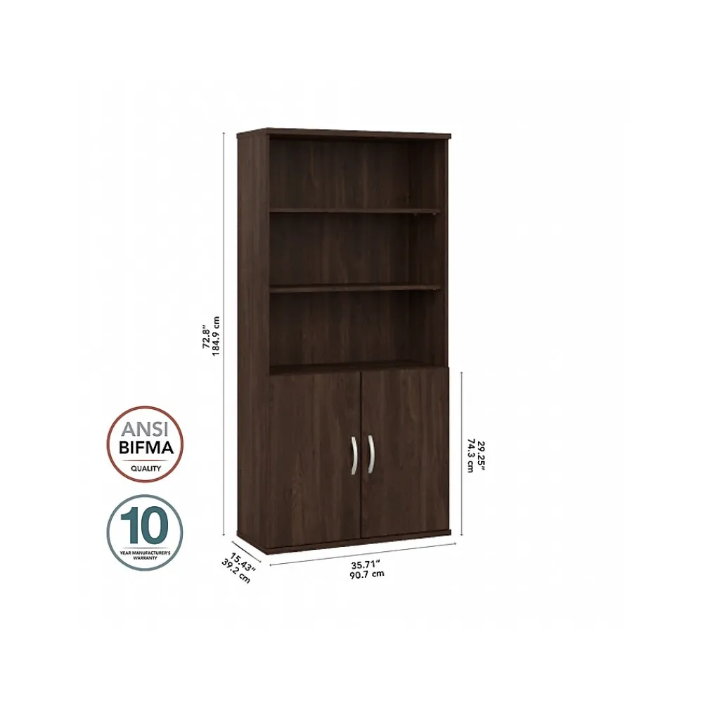 The Bush Business Furniture Hybrid tall five-shelf bookcase with doors offers a stylish, long-lasting storage and display solution for the modern professional. Organize books and other reference materials, or give your workspace a personal touch with pictures and decorations on shelves that support up to 50 lbs. each. Two shelves are fixed for stability, while three can be raised or lowered to accommodate items of various sizes. Cabinet doors conceal the two lower shelves for the materials you want to be kept in order but out of sight. The tall bookshelf’s stable design and included wall attachment hardware make it a safe choice for use in virtually any home or professional office environment. Find the perfect look for your space with five contemporary finish options: black walnut, modern hickory, platinum gray, storm gray, and white. This tall bookcase cabinet has been meticulously tested to meet or exceed ANSI/BIFMA quality standards for safety, durability, and performance and is backed by the Bush Business Furniture 10-year manufacturer warranty. See the full Bush Business Furniture Hybrid collection for coordinating items to enhance your workspace as needed, including computer desks, file cabinets, and storage cabinets (coordinating items sold separately). American-made with US and imported parts.