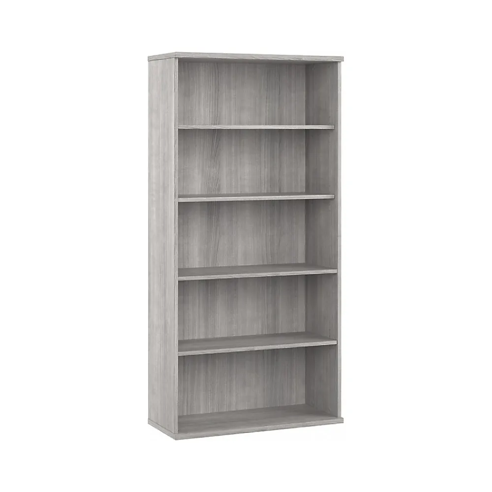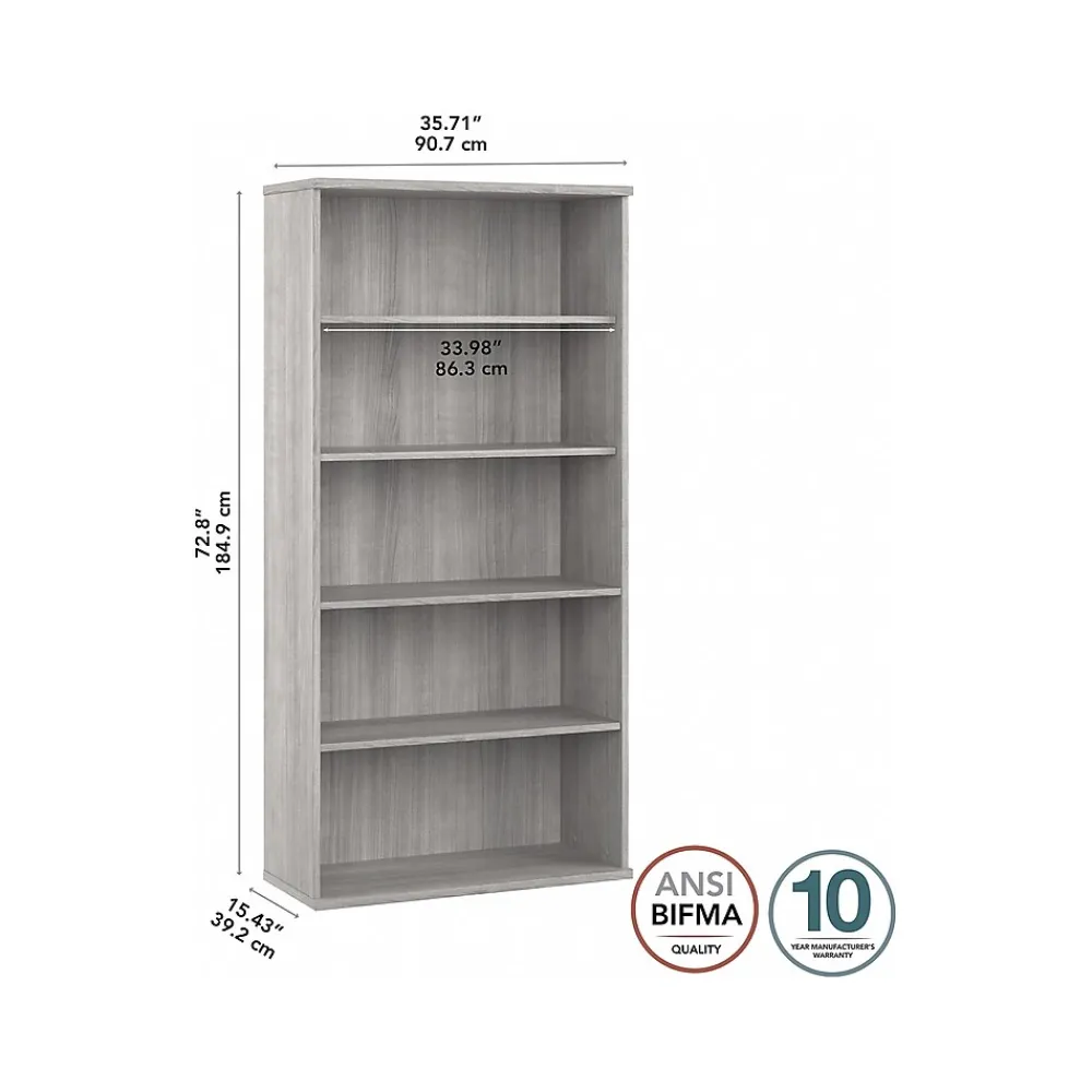 The Bush Business Furniture Studio A tall five-shelf bookcase with doors combines a fresh contemporary appearance with the commercial-quality construction needed to withstand years of everyday use. Organize books and reference materials, or display pictures and decorations on the shelves that support up to 50 lbs. each. Two shelves are fixed for stability, while three can be raised or lowered to accommodate items of various sizes. The tall bookcase’s stable design and wall attachment hardware make it a safe choice for use in virtually any home or professional office environment. This tall bookcase has been meticulously tested to meet or exceed the ANSI/BIFMA standards for safety, durability, and performance and is backed by a 10-year warranty. American-made with US and imported parts.