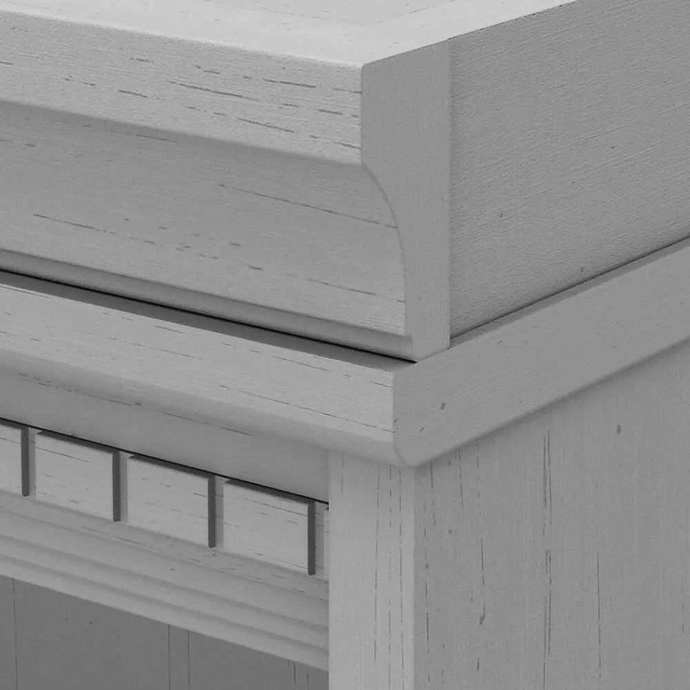 - Distressed finish options include solid Cape Cod gray, antique white with tea maple, pure white with shiplap gray, or antique black with Hansen cherry