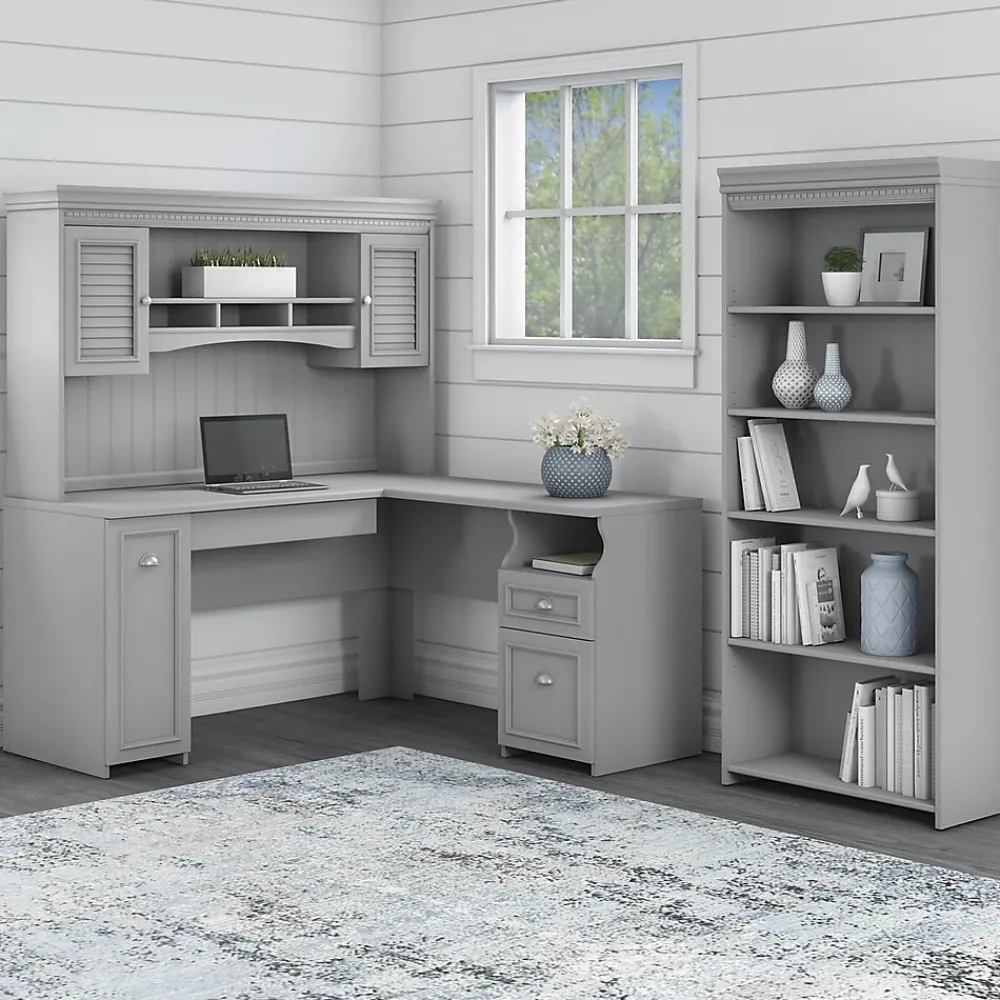 Bring a slice of modern farmhouse styling into any home office or living space with the Bush Furniture Fairview tall five-shelf bookcase. Three adjustable shelves move up and down to accommodate books and decorations of various sizes while two fixed shelves provide extra stability. Each shelf supports up to 50 lbs., so organizing a collection of paperback and hardcover books is no problem. This bookcase offers plenty of vertical storage to keep your personal library in order without taking up too much floor space. Use a single bookcase on its own, or place a set of two or more side by side for even more storage and display capacity. This farmhouse bookcase is tested to meet ANSI/SOHO quality standards for safety and performance and is backed by a 6-year manufacturer warranty. See the full collection for coordinating items to complete your space with relaxed cottage styling.
