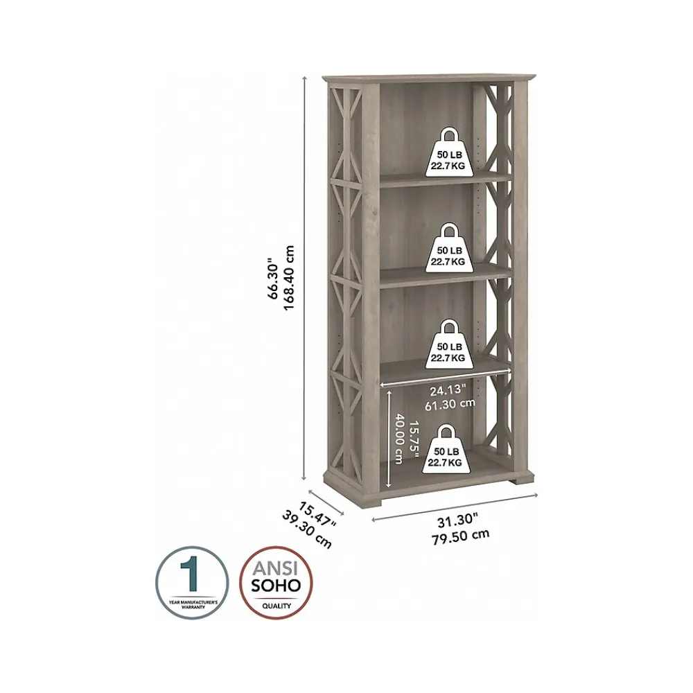 Organize books or give your workspace a personal touch with the Bush Furniture Homestead four-shelf farmhouse bookcase. Safely display pictures and decorations on shelves that support up to 50 lbs. each. Two shelves are fixed for stability, while two can be raised or lowered to accommodate items of various sizes. Tip Guard safety features include a stable design and wall attachment hardware for family-friendly safety in any space. The bookcase has been tested with a 50 lbs. hanging weight to create a safe environment in any work or living space. The decorative trestle pattern and chamfered profile edges give this bookcase a casual farmhouse style. This bookcase has been meticulously tested to meet or exceed the ANSI/SOHO quality standards for safety, durability, and performance and is backed by a 1-year manufacturer warranty. See the full collection for coordinating items.