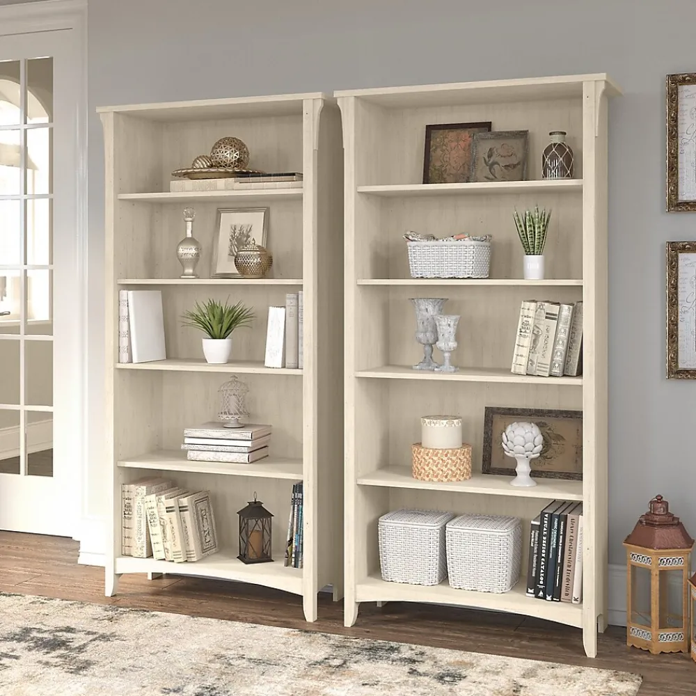 Decorative yet functional, this Bush Furniture Salinas set of two five-shelf bookcases brings comfortable storage and display to any room in your home. Inspired by timeless mission style, the set conveys a relaxing farmhouse charm with its attractive wood accents and tapered legs. Decorative detailing and curved base rails create a casual construction equally fit for a living room or home office. Each tall bookcase is built with three adjustable shelves for flexible storage and two fixed shelves for stability to proudly display your personal library along with photos and decorations. Each shelf supports up to 50 lbs., so storing larger items is never a problem. This matching bookcase set is tested to meet ANSI/SOHO standards for safety and performance and is backed by a 1-year manufacturer warranty. See the full collection for coordinating items available.