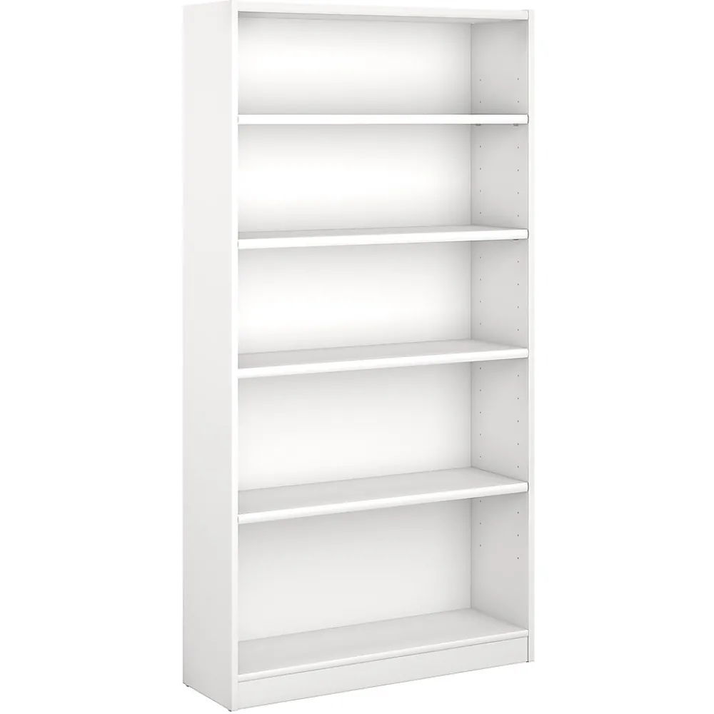 The Bush Furniture Universal 5 Shelf Bookcase features two fixed shelves for added stability and three adjustable shelves for storage flexibility. Personalize your home or office with books, photos, plants and decorative accents with sturdy 1 inch thick shelves. Design a complete wall unit or place coordinating bookcases anywhere in your interior with seven finishes and three height options. Family-friendly wall attachment hardware included. You’ll find many uses for this heavy-duty tall Bookcase in your home office, bedroom or small business. Solidly constructed, the 5 Shelf Bookcase meets ANSI/BIFMA standards for safety and performance. Backed by a 1 Year Warranty.
