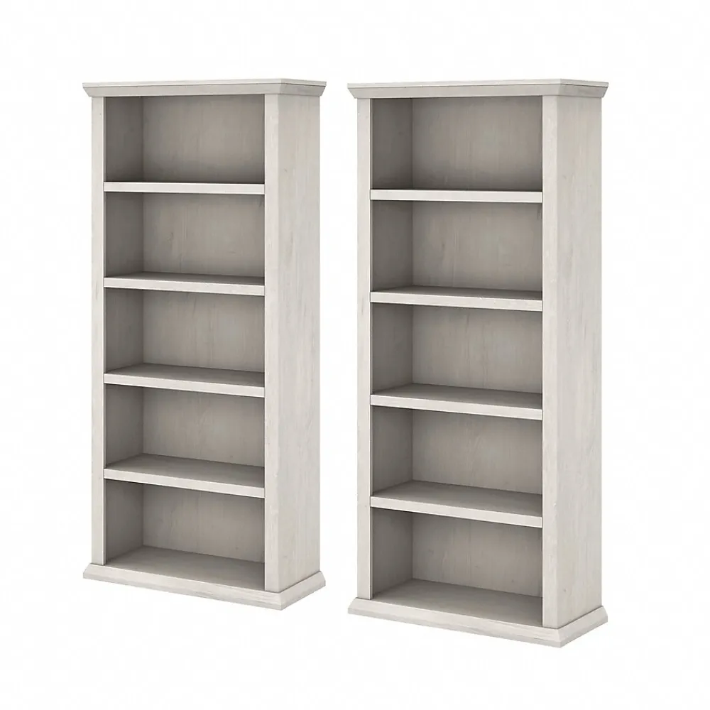 The Bush Furniture Yorktown tall five-shelf bookcase set of two presents a stylish and practical solution for organizing any work or living space. Use the matching bookcases to showcase your personal library or brighten up the room with pictures and home decor. Both bookcases include three adjustable shelves that move up and down to accommodate items of various sizes and two shelves that are fixed for stability. Each shelf supports up to 25 lbs., so you can store a collection of hardcover books and display larger decorations with confidence. Wall attachment hardware is included for family-friendly safety and security. Bush Furniture Yorktown’s classic charm is highlighted by stylish beveled edge detailing and comes in linen white oak finish. This tall bookcase set is tested to meet ANSI/SOHO standards for safety and performance and is backed by a 1-year manufacturer warranty.