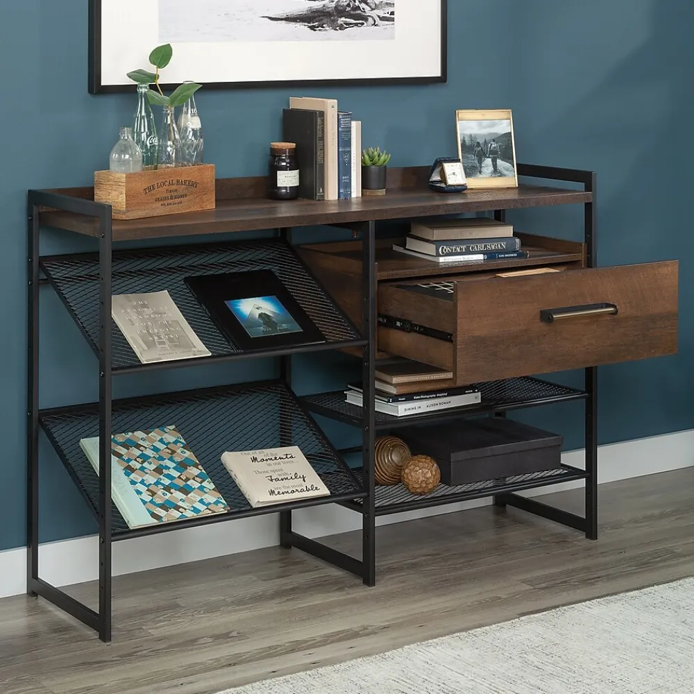 A unique bookcase for your unique needs. This bookcase with drawer from the Briarbrook collection is the distinctive element your home has been missing. This bookcase with storage features a drawer with metal runners and safety stops that can hold a variety of items: office supplies, writing materials, and general storage. The top surface of this display bookcase features a cornered edge for displaying home decor and photos of your family. This bookshelf with drawer features shelves that can be tilted for displaying books, magazines, artwork, and photos. A highly configurable design allows for customizable placement of shelves and drawer, all according to your personal preference. This bookcase with shelves is finished on all sides for versatile placementit will look polished and complete from every angle. Finished in Barrel Oak with powder coated metal shelves and frame, this modern bookshelf will catch the eye of guests, and make you proud of your purchase.
