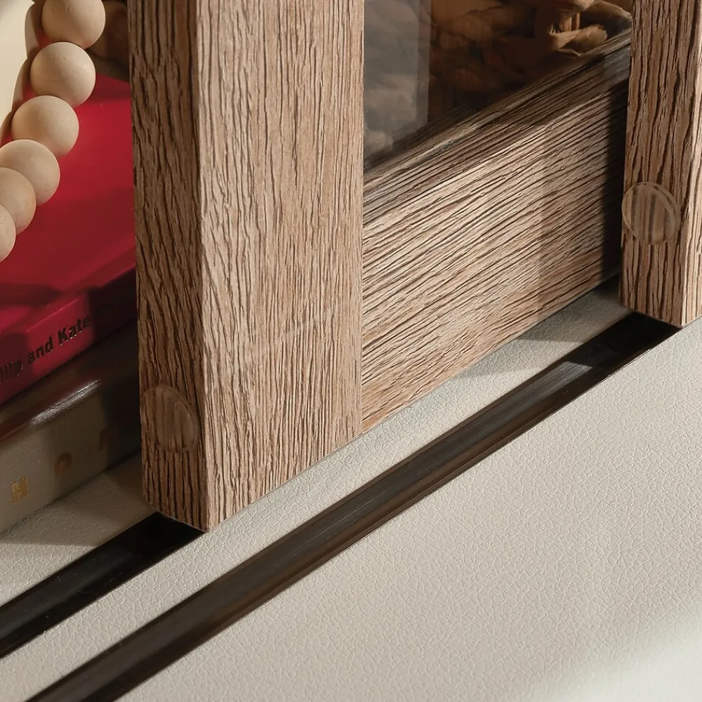 The bookcase with sliding doors from the Dixon City collection has a rustic farmhouse appeal coupled with a touch of contemporary style. Finished in the natural tone of Brushed Oak with Pebbled White accent, the diagonal trestle detailing at the top of the glass doors lends an architectural element to the otherwise simple design. The safety-tempered glass sliding doors of this commercial bookcase open to reveal two adjustable shelves and a fixed shelf, designed to stylishly meet ever-changing storage demands. At the bottom of the bookcase with doors is a file drawer with full extension slides that will hold legal or letter size hanging files. This residential office furniture has strong and lightweight panel construction for added style and versatility of placement within your home office. This 4-shelf bookcase meets BIFMA standard x5.9 for safety, durability, and structural performance. Hardware with a rubbed bronze finish adds a touch of glam to this office storage bookcase, for the ultimate modern farmhouse meets luxury appeal.