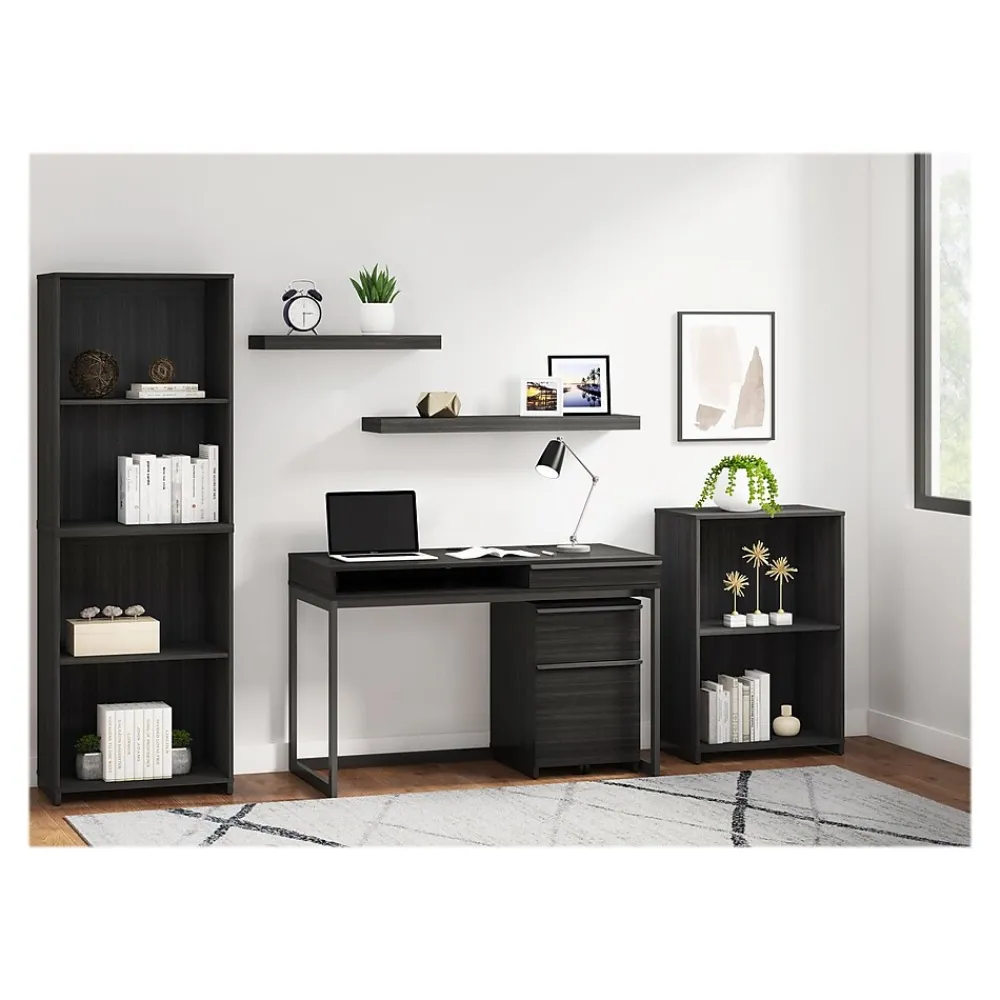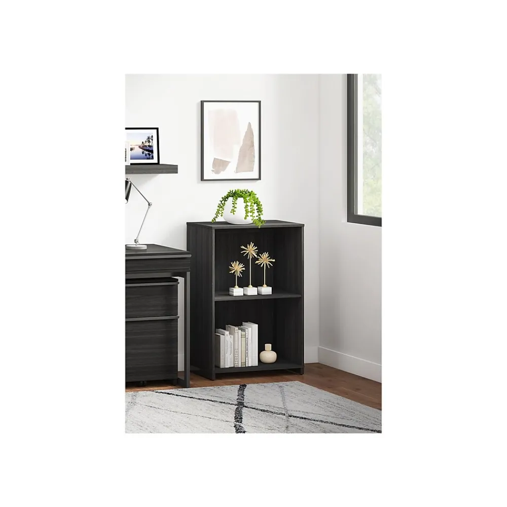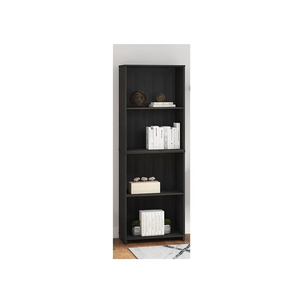 - Modern-style bookcase provides plenty of storage space, featuring a durable laminate construction in a burnt ash finish