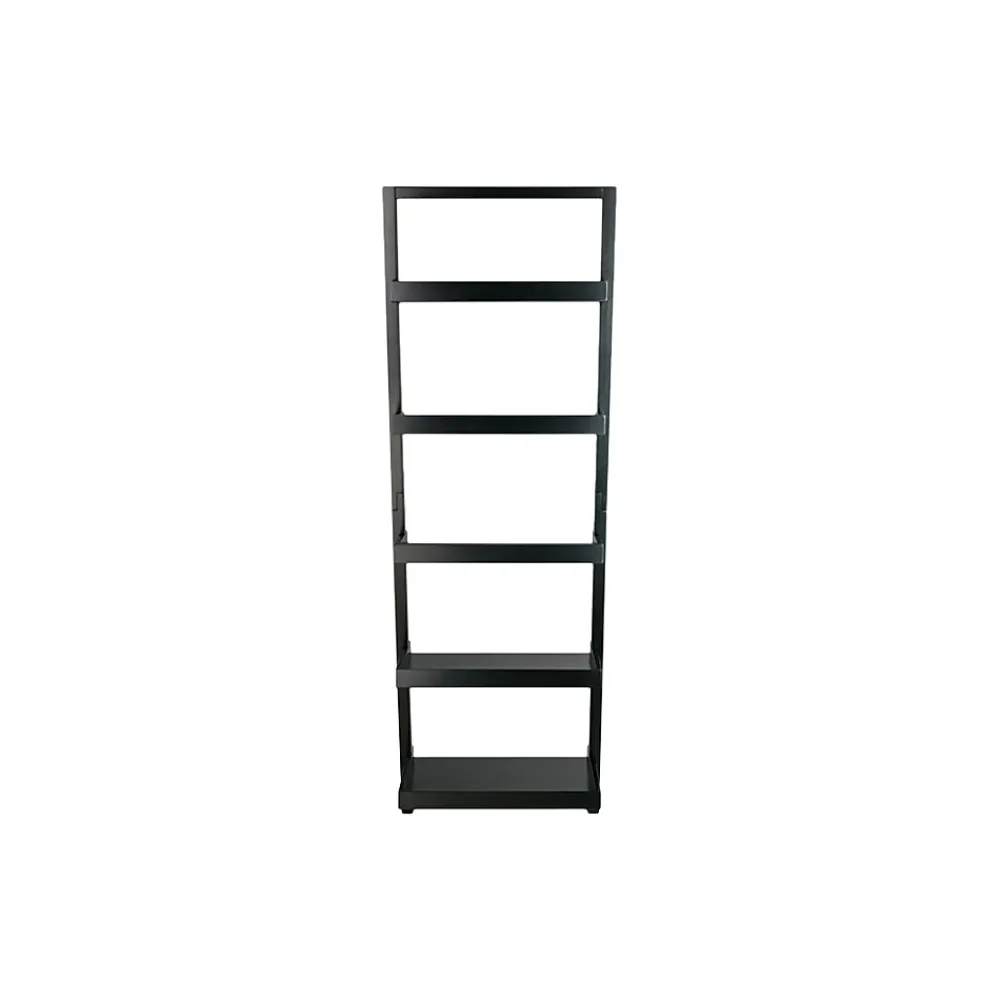 - Leaning black bookcase provides plenty of storage space and features durable wood construction