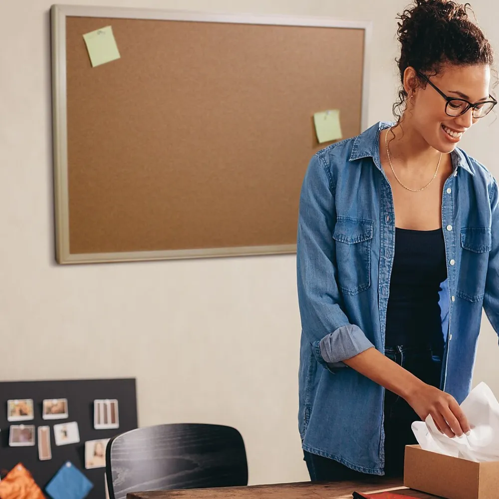 These cork boards are constructed of a fine grain natural cork skin laminated to a durable insulation board. Surface resists wear and tear of repeated tacking. Hardwood framed. Measures 24″ x 36″.