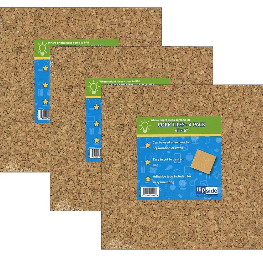 Cork tiles are ideal for a variety of arts and crafts projects. Self-healing cork in light mottled brown can be painted, cut, and added to other materials to create a one-of-a-kind project. Can also be backed with fiberboard and framed for use as bulletin boards. Come with adhesive tabs for mounting. Tiles are 6″ x 6″ and 1/8″ thick. Each pack includes 4 tiles. Sold as 3 packs, 12 tiles total.