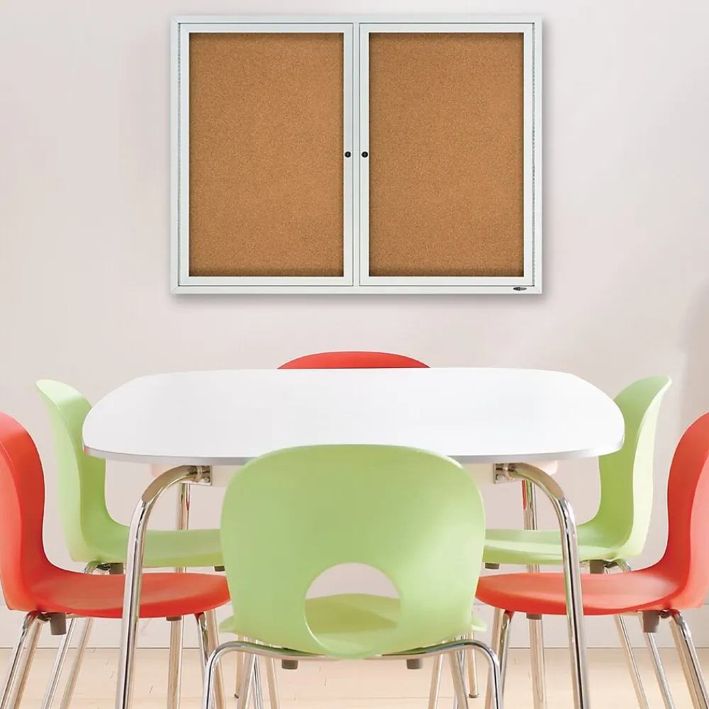 Reach desired audiences by presenting newsletters, announcements, and pictures on this enclosed cork bulletin board. Two locking, swinging doors and shatterproof tempered glass enclose this bulletin board, keeping publications safe and secure. The self-healing cork and aluminum casing on this bulletin board offer long-lasting durability. This Quartet cork bulletin board has a vented frame to keep moisture at bay, allowing for clear viewing.