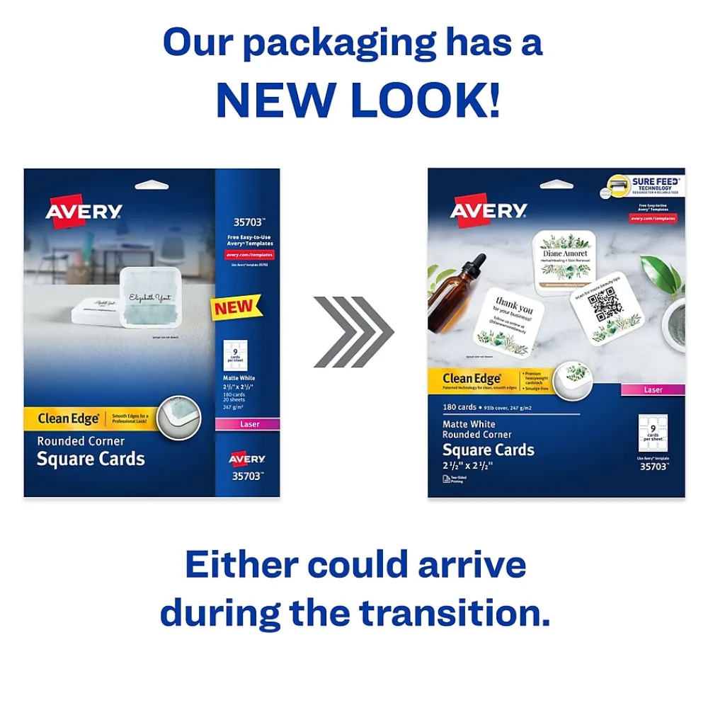 Make sure your cards stand out with Avery 35703 square cards with rounded corners. This pack of 180 first-rate customizable business cards is made from quality cardstock with a weight of 91lbs / 247gsm, and offers an impressively substantial look and feel, while the curved corners help avoid snagging and creasing. If you need professional quality business cards, customer loyalty cards, appointment reminder cards, product price tags or more, these 2.5″ x 2.5″ cards are an exceptional way to stand out from the crowd. These white business cards have innovative Clean Edge technology for quick and easy separation, giving you the cleanest, smoothest edges of any business card on the market. Also, proprietary Avery Sure Feed technology helps reduce misalignments, minimize paper jams, and avoid wasted projectswhen printing on your laser printer.Whether you have your own design or you’re creating one from scratch, take your brand or business to the next level with Avery Design & Print Online, which makes it easy to create and print double-sided customizable cards from your own home or business. The free browser-based software has everything you need to design business thank you cards, appointment cards, reward cards, mini RSVP cards, cute business cards and more. Try it out today on the Avery website and print at home or in the office on your laser printer.
