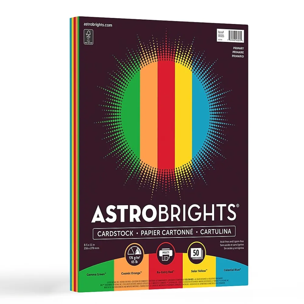 Let your imagination take off with Astrobrights colored cardstock, in Primary 5-Color Assortment. Creative geniuses and novices alike can create flyers, invitations, presentation covers, scrapbooking, school projects and DIY paper crafting. Display and store projects with confidence, since each sheet is lignin and acid-free. Plus, this cardstock works well with copiers, inkjet, and laser printers. Astrobrights cardstock is also compatible with electronic cutting machines so you can create intricate letters, shapes and other designs. Save money on pricey full-color ink – just add black ink! Brighter Colors. Brighter Ideas.