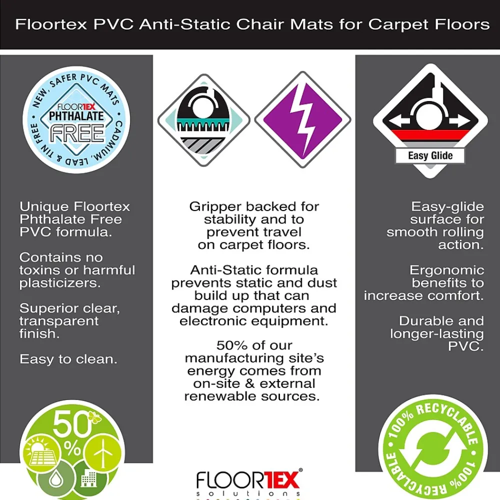 - All Floortex PVC/ Vinyl protector mats are produced at our manufacturing site where 50% of the energy comes from on-site and external renewable sources. Contains up to 25% recycled content and 100% recyclable for a reduced carbon footprint