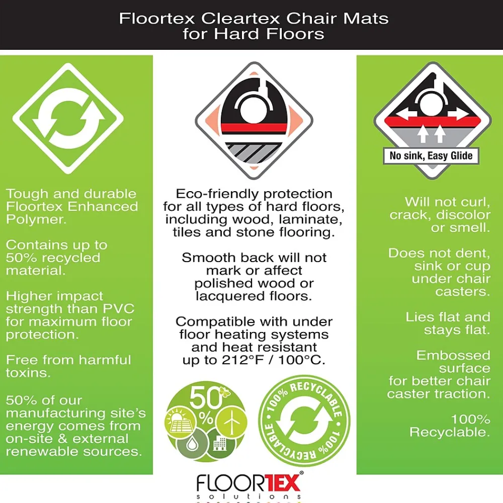 High impact strength for excellent easy glide rolling, Evolutionmat protectors will not cup, crack, curl, discolor or smell. Environmentally safe, free from Phthalates, PVC and toxic chemicals. Eco-friendly manufacturing with 50% of our manufacturing site’s energy coming from on-site and external renewable sources. 100% recyclable. Lies perfectly flat from delivery for immediate use.
