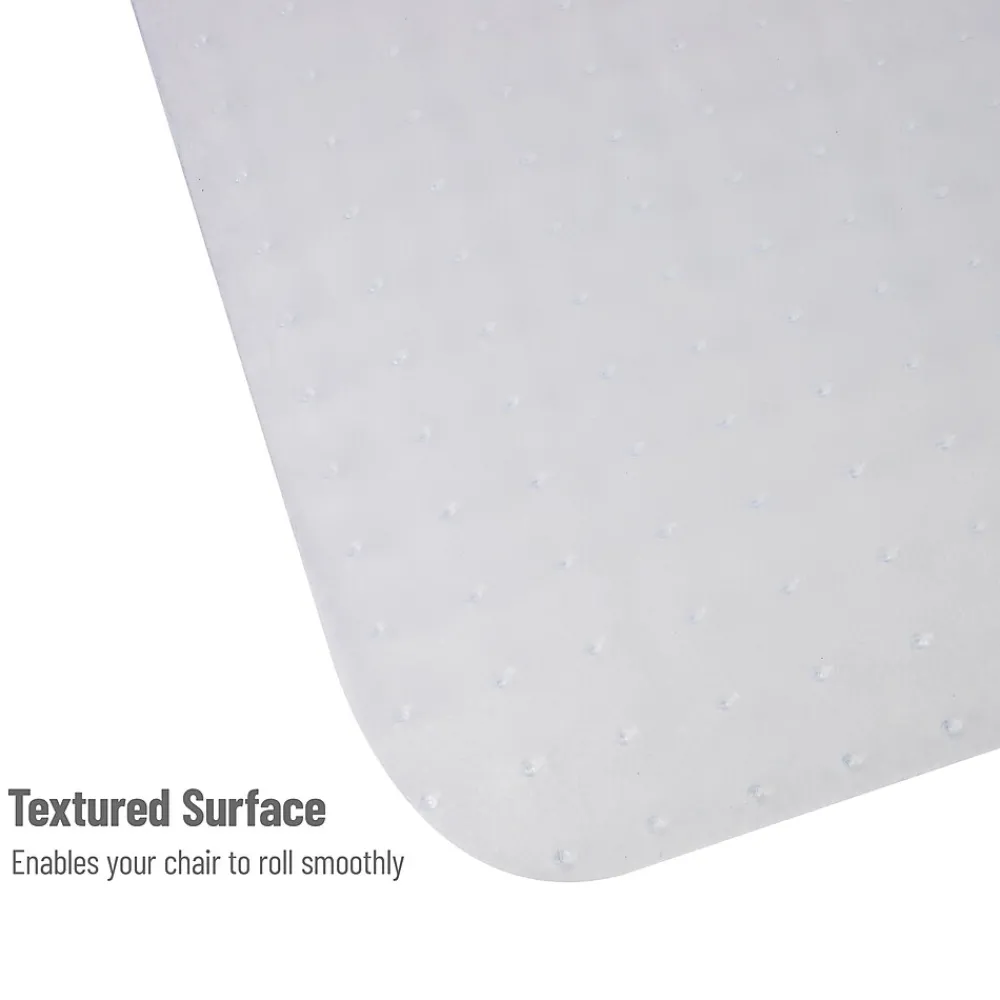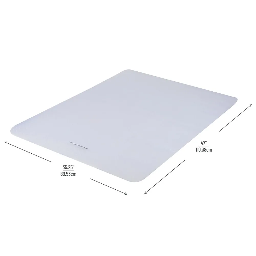 Introducing the essential office chair mat you need for your office or home workspace. Crafted to make your chair gliding smooth and effortless, it ensures the best of both worlds: freedom of movement and stationary stability. The anti-skid and carpet-gripping bottom ensures that the mat stays firmly in place even when you roll around.It’s clear background melds flawlessly with your office decor, making it inconspicuous yet highly practical. With dimensions of 47.5 inches in length and 35.5 inches in width, it’s ideally sized for most spaces. No assembly is required upon delivery, though its flexible nature might require some time to lie flat after unrolling. Expedite the process by rolling it the opposite way a few times or using a blow dryer to soften the plastic. Alternatively, soaking the mat in warm water can help it relax and flatten. Ensure the mat is fully dry before placing it on the floor. This office chair mat makes for an excellent gift for students, those starting their first work-from-home job, or anyone initiating a side hustle at home. Don’t forget to check out other items in our 9-to-5 collection to give your office space a complete makeover.