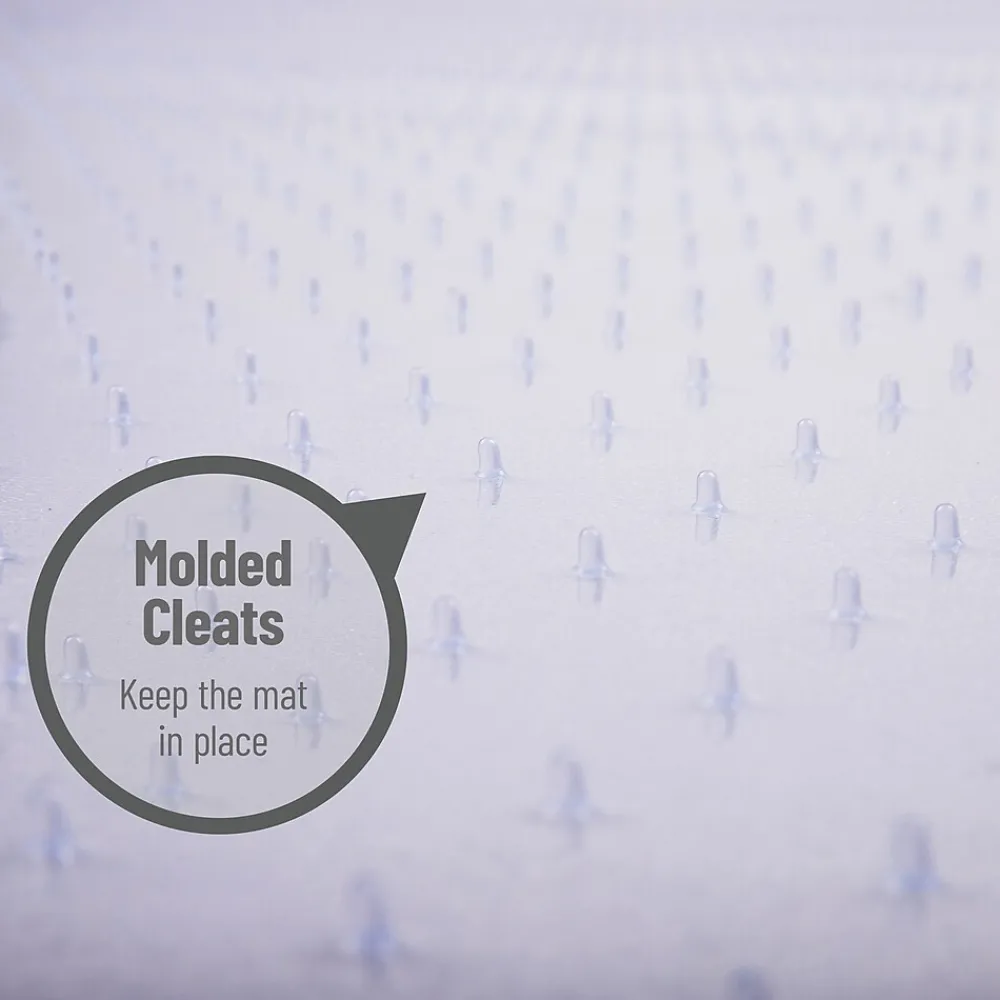 Experience smooth mobility and enhanced comfort at your workspace with our PVC office mat. Designed specifically for use on low pile carpeting, this mat features molded cleats on the underside to secure it in place, preventing slips and shifts as you move.Constructed from flexible, durable PVC, this office mat offers superior resistance to tearing and breaking, outlasting thinner, less resilient mats. It stands up to daily wear and tear, saving you the hassle and expense of frequent replacements.Cleaning this office mat is a breeze. Simply wipe it down with a soft cloth and mild soap and water to keep it looking and performing its best.Shipping and setup couldn’t be easier. The mat is delivered flat, with no assembly required. You can simply unpack it and place it in your desired location, ready to support you through your workday.Upgrade your home or office workspace with our sturdy, comfortable PVC office mat, and enjoy a more comfortable and mobile work experience on your low pile carpet.