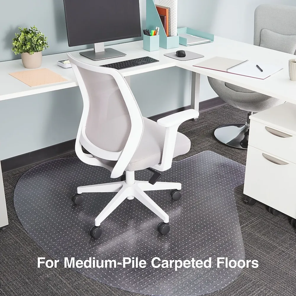 Extend the life of your medium pile carpet (up to 3/4″ thick including padding depth) by protecting against chair caster wear and tear. The perfect addition to your workspace, this chair mat provides a smooth surface that enhances ergonomic comfort by allowing your rolling office chair to move freely. Easy to handle, this chair mat features rounded AnchorBar cleats (studs) that hold your mat in place and are gentle on carpets and fingers (no sharp spikes). This chair mat is made with durable vinyl that is GREENGUARD Gold Certified for low chemical emissions to promote a healthier workspace. Designed for use on carpeted surfaces only, do not use on hard floors.