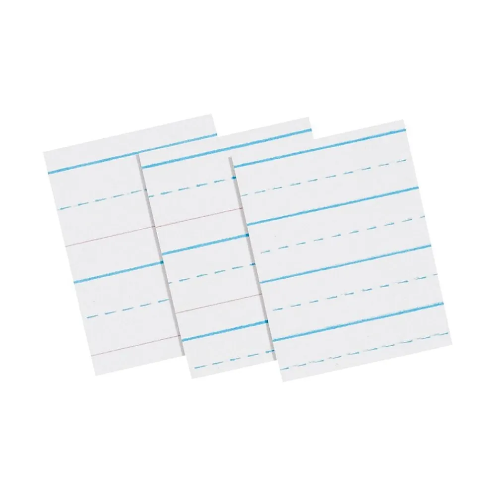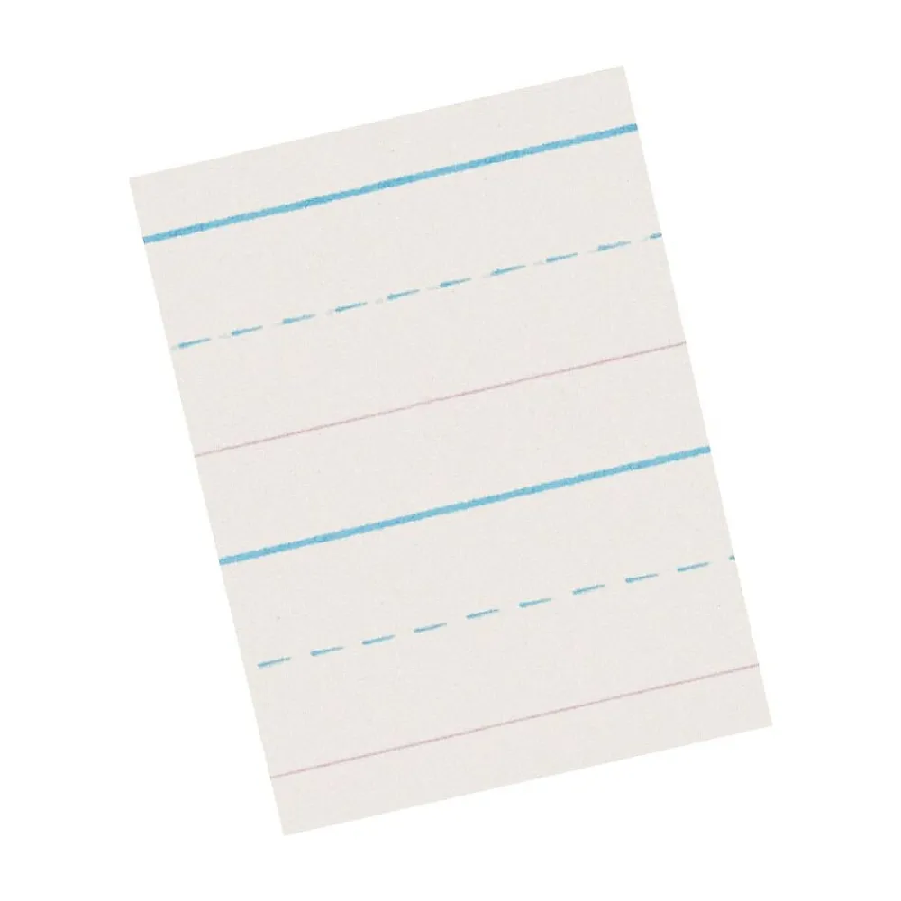 Clean white newsprint printed both sides with blue headline, broken blue midline, red baseline and skip-A-line format. Rulings conform to D’Nealian™ handwriting program.