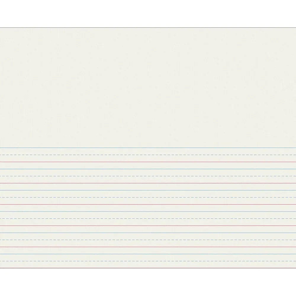 Clean white newsprint printed both sides with blue headline, broken blue midline, red baseline and skip-A-line format. Rulings conform to D’Nealian™ handwriting program.