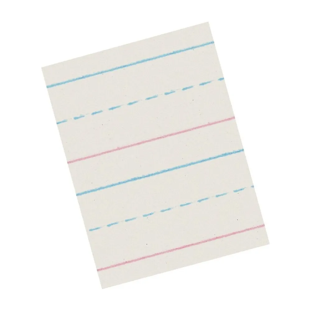 Clean white newsprint printed both sides with 6″ blank space at the top of the sheet. Red baseline, broken blue midline and skip-A-line format. Recyclable.