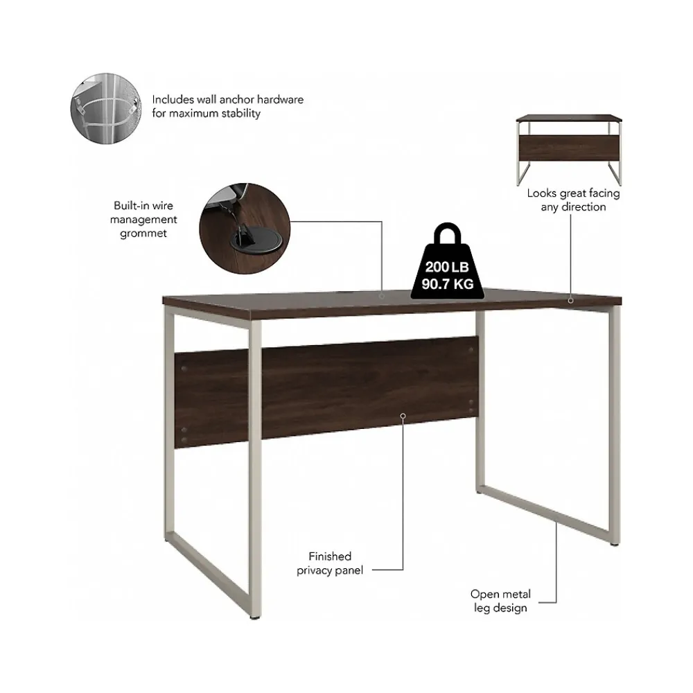 The Bush Business Furniture Hybrid 48″W x 30″D computer table desk blends a durable work surface with sturdy metal legs to offer a stylish, long-lasting solution for the modern professional. Tackle your next project or assignment with a computer, books, paperwork, and more on a desktop that supports up to 200 lbs. A built-in wire management grommet keeps cords and cables in order, so your work area remains free from unnecessary clutter. The computer desk’s open leg design and finished privacy panel allow it to look great facing any direction in a home or professional office environment. Find the perfect look for your space with five contemporary finish options: black walnut, modern hickory, platinum gray, storm gray, and white. This modern desk has been meticulously tested to meet or exceed ANSI/BIFMA quality standards for safety, durability, and performance and is backed by the Bush Business Furniture 10-year manufacturer warranty. See the full Hybrid collection for coordinating items to enhance your workspace as needed, including file cabinets, bookcases, and storage cabinets (coordinating items sold separately). American-made with US and imported parts.