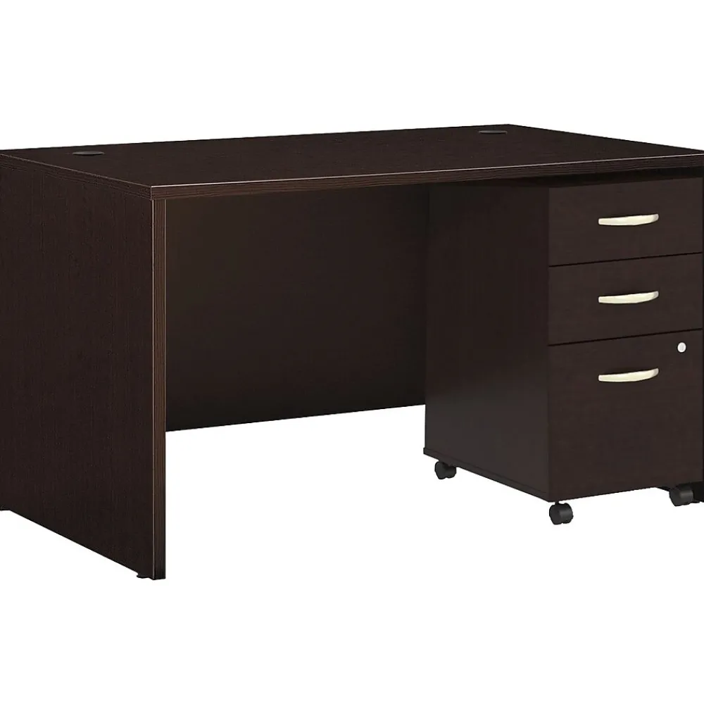 The Bush Westfield desk in mocha cherry is an excellent addition to a home or professional office environment. The desk has a thermally fused laminate surface, which is scratch and stain resistant, and a three drawer mobile pedestal. The pedestal includes two box drawers and one file drawer. The Bush Westfield desk has technology-friendly desktop grommets which allow you to easily set up phones or computers. The desk is also American made and GSA approved.
