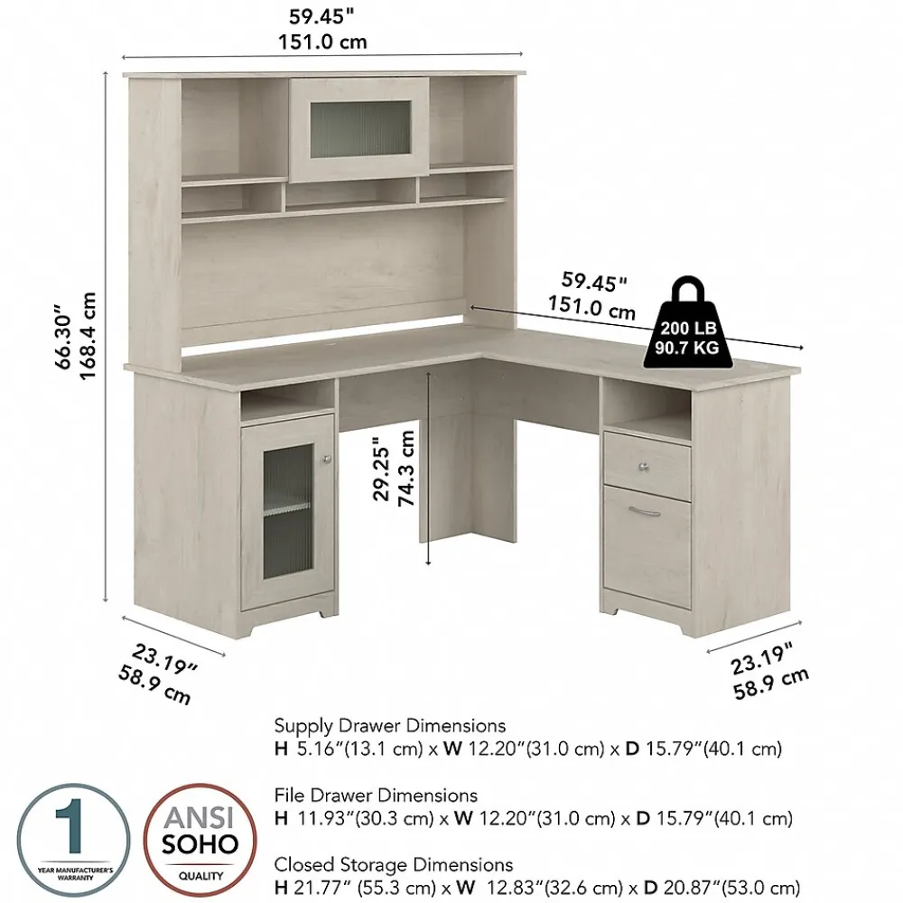 The Bush Furniture Cabot 60W L Shaped Computer Desk with Hutch and Storage presents a home office solution with transitional style. The spacious L Shaped Desk surface supports up to 200 pounds and includes built-in wire management to keep cords and cables out of the way. Organize materials and supplies inside a storage cabinet that contains one adjustable shelf. The file drawer opens on smooth full-extension ball bearing slides for an effortless reach to letter, legal, and A4-size paperwork while a smaller box drawer keeps small office supplies in order. The Desk Hutch adds another closed compartment behind a fluted glass door along with right and left shelves for flexible storage and display. This corner desk with drawers, storage cabinet, and hutch has been rigorously tested to meet or exceed ANSI/SOHO quality standards for safety and performance and is backed by a 1 Year Warranty.