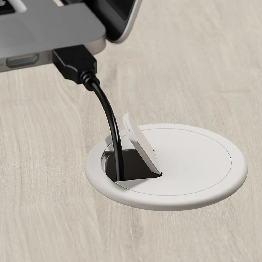 - L Desk’s surface features built-in wire management grommets to keep cords and cables out of the way