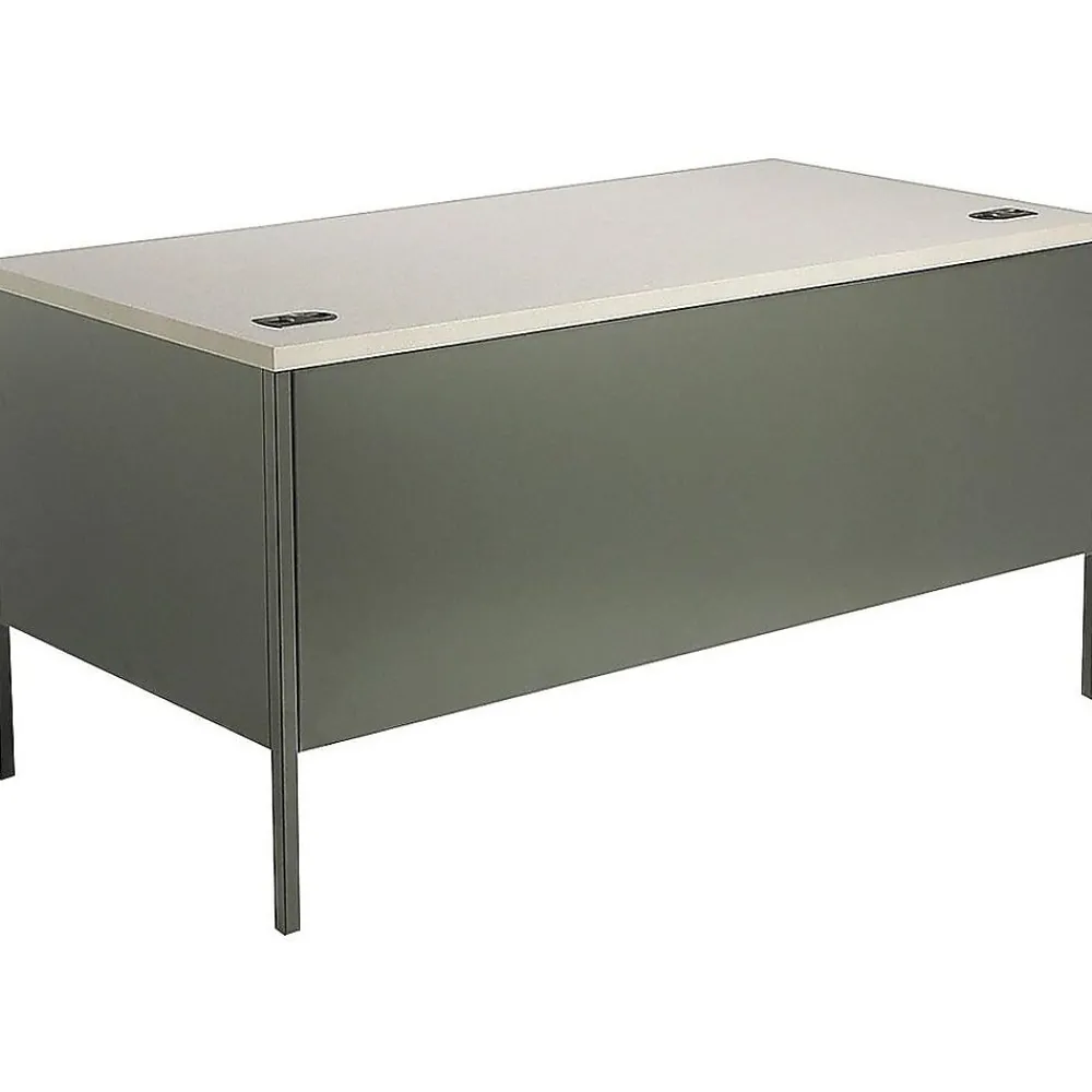 Enjoy ample workspace and storage with this 60-inch pedestal desk. The gray laminate surface resists stains and scratches for durability under everyday wear and tear, and a universal lock conveniently secures all drawers with a single key turn. This charcoal-finish HON Metro Classic desk contains two box and two file drawers, plus rear and side modesty panels for added privacy.