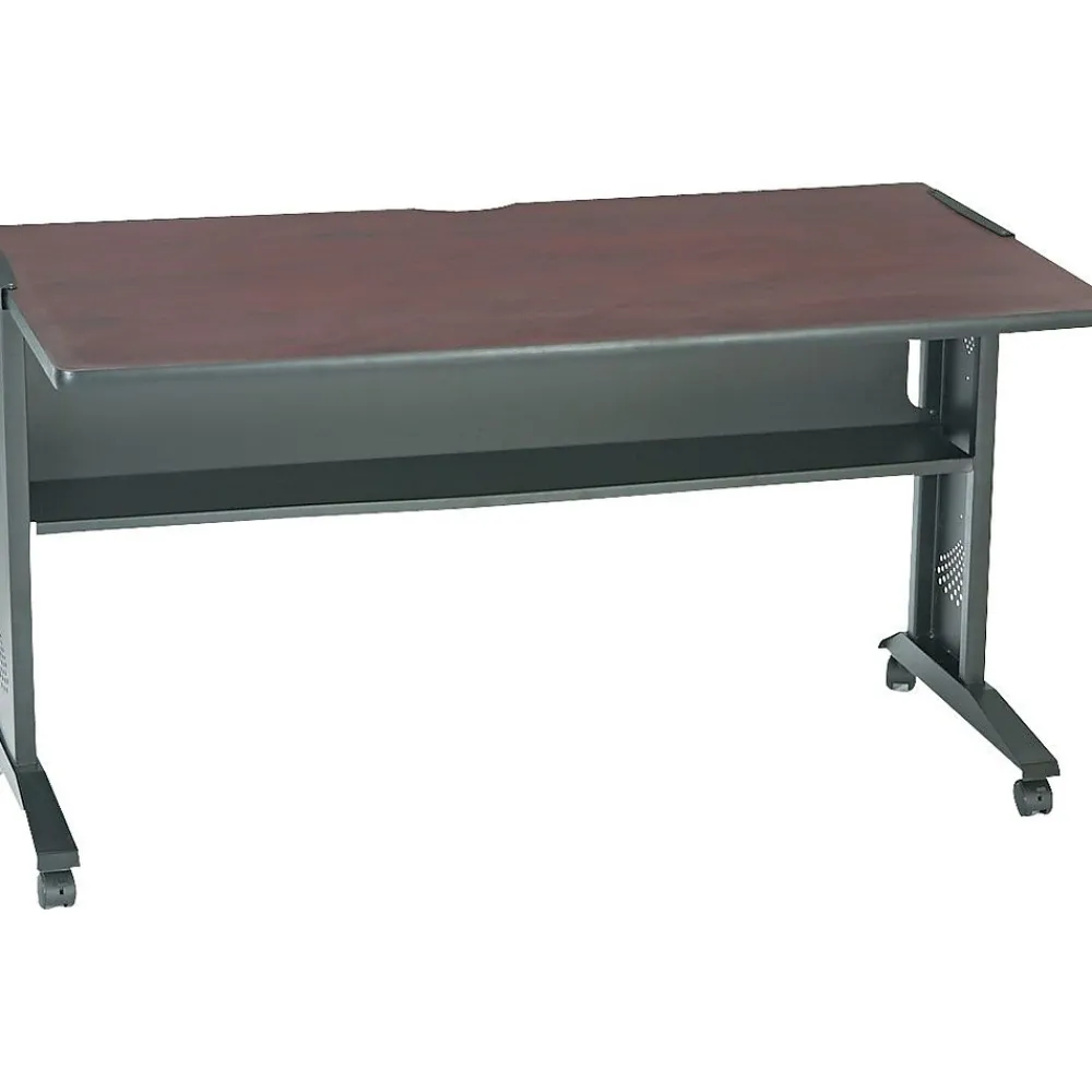 The Safco reversible top computer desk is a slim and simply designed workstation, which makes for an ideal fit for every workspace regardless of its existing decor. Constructed with a black steel base for additional stability, it has U-Shaped legs. This Safco reversible top mobile workstation has reversible tops that see a 1-inch laminate top being reversed between mahogany and medium oak and also features a wood top. Relocation at the blink of an eye is also made possible with wheels attached to the legs for this mobile computer desk. It also features a modesty panel that doubles as storage space providing quick access to essential supplies.