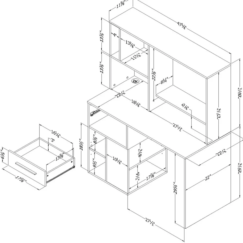Need a hand organizing your workspace? This desk, with its many compartments, gives you a world of options for putting things away more easily. The hutch was designed to hold a computer screen, which will free up your workspace. It has 3 open spaces and a shelf, so you can organize all your materials, and also put a printer under the shelf. Under the desk are 5 open spaces, where you can keep binders, notebooks, papers, and books. There’s also a small drawer for keeping anything that doesn’t have a home out of sight. Finally, we’ve added a hole for passing cords through, along with 4 USB ports, for simple, efficient cord management. You’ll get your work done more quickly than before – and you’ll find you’ve never been so motivated!