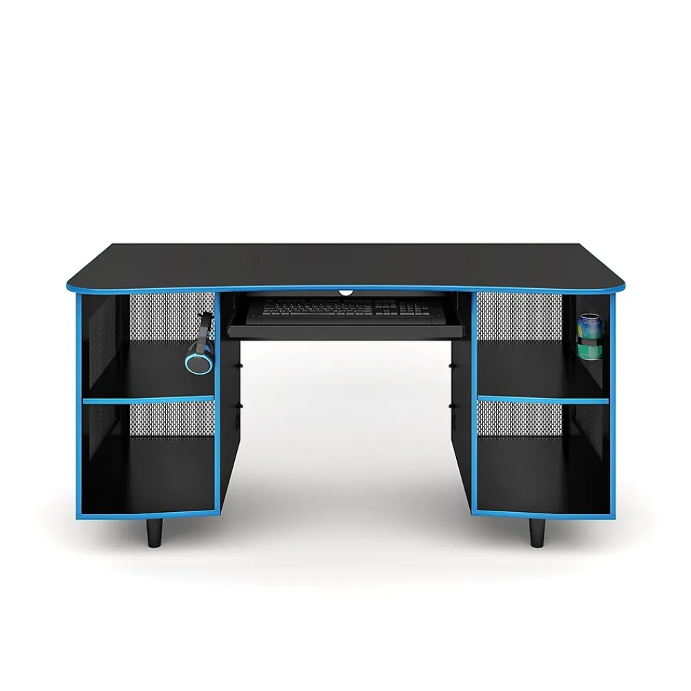 Assemble a complete set of gaming gear on this black computer desk. The spacious tabletop offers plenty of room for multiple monitors, and the ventilated storage cabinets, accessory trays and cable management ports provide neat organization for a CPU and peripherals. The cut-away curved front design of this Whalen Emergent Gaming desk keeps gamers up close to the cyber battlefield.