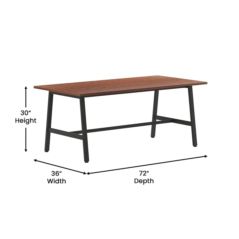Foster big thinking during brainstorming sessions or encourage open communication and interaction between stakeholders during important meetings with this 72×36 commercial grade conference table. Available in timeless finishes that will blend well in any environment, this boardroom table will make a statement while providing ample space for multiple guests. The liquid and scratch-resistant 1 inch thick table top with a durable laminate finish on both sides and PVC edging increases durability for long-lasting use. The heavy-duty, powder coated, A-frame steel base comes with included hardware and easily attaches to the underside of the table into the predrilled holes. This conference room table holds up to 300 lbs. static weight, and features adjustable floor glides ensuring a level surface. Assembly takes less than 10 minutes and cleanup is easily achieved with a damp cloth.