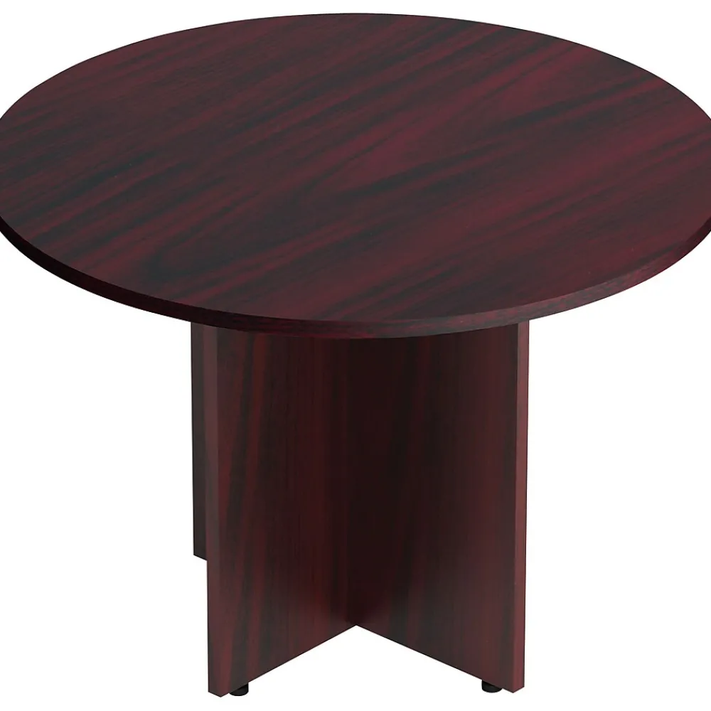 This 42-inch conference table features a round top and an X-shaped base, offering high-end appeal while remaining budget-friendly. Crafted in an American Mahogany finish, the SL42R table from the Offices To Go Superior Laminate collection is versatile, serving effectively in conference rooms, meeting spaces, and private offices.