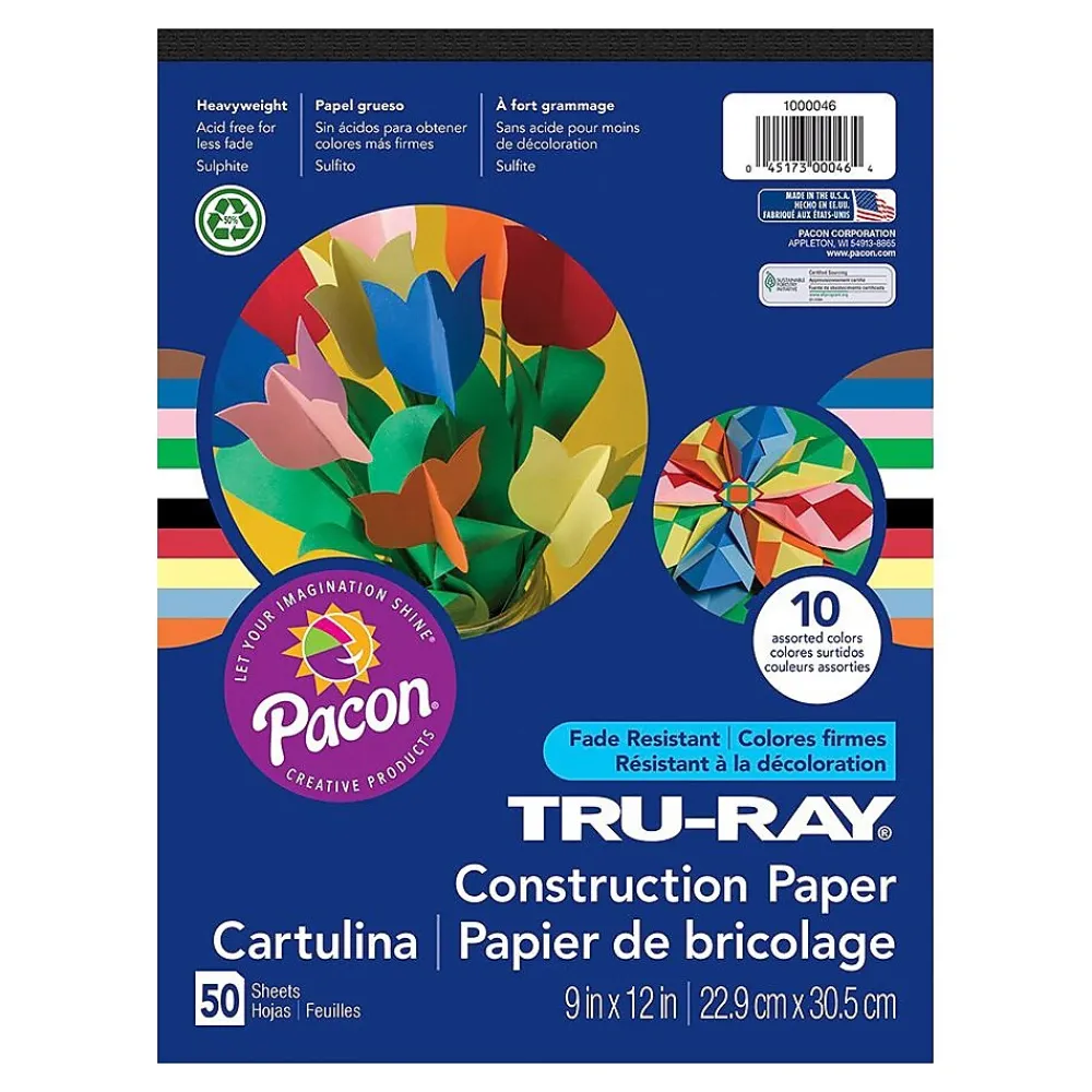 The Pacon® Tru-Ray® assorted sulphite construction paper pad with smooth finish, resists fading and allows colors to stay bright. This paper pad measuring 9″ x 12″, is great for all art projects. It is acid free and contains 50 percent recycled fiber.