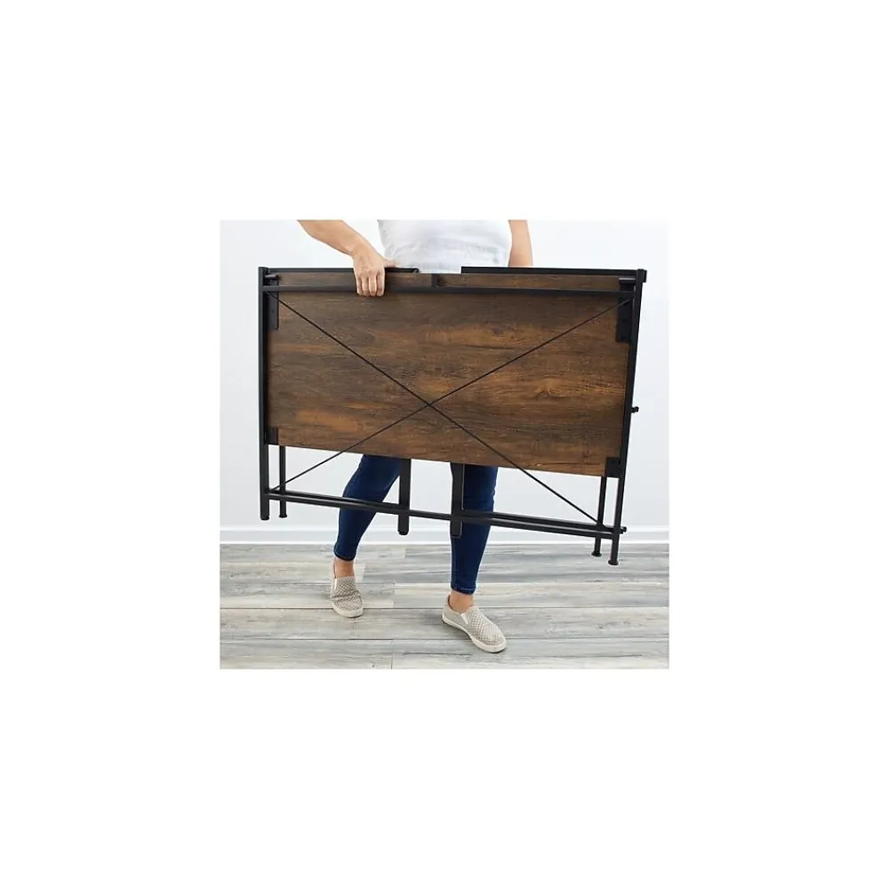 - Features industrial style, with a thick MDF panel top in a wood grain finish and heavy-duty powder-coated steel frame in black