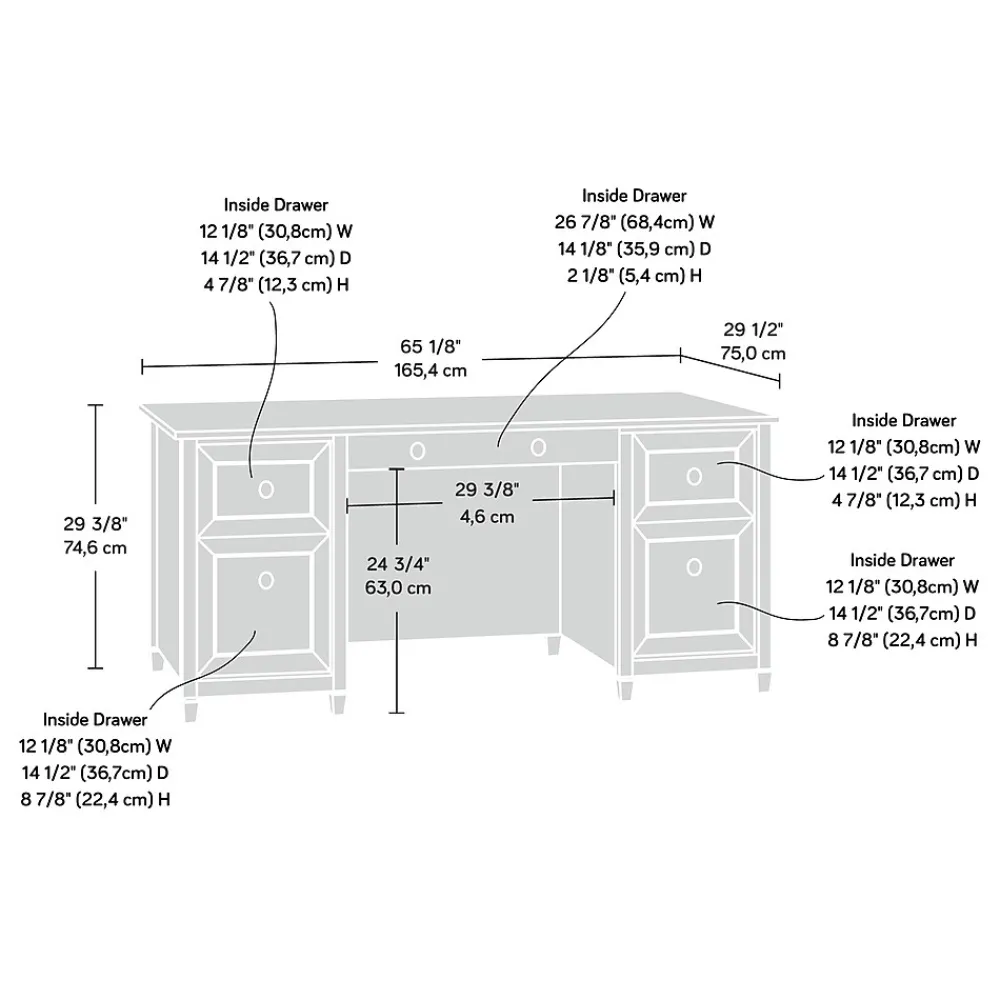 Add a sophisticated touch to any office with this executive desk. The spacious tabletop offers plenty of room for computers, notepads and other essentials, while the two small drawers provide extra storage options for sticky notes, calculators and other office accessories. With a black finish, this desk delivers a professional, handsome appearance, and the durable construction makes it a long-lasting choice. Two file drawers with full-extension slides make it easy to store letter-size hanging file folders, so you can access important reports, statements and other paperwork quickly. Keep cords tidy, thanks to the grommet holes that provide cable management. This Sauder Edge Water Collection executive desk has a T-lock drawer system for simple assembly and a large sliding shelf with a flip-down panel, allowing for the keyboard and mouse to be neatly tucked away when not in use.