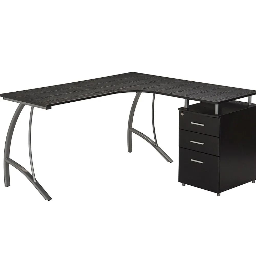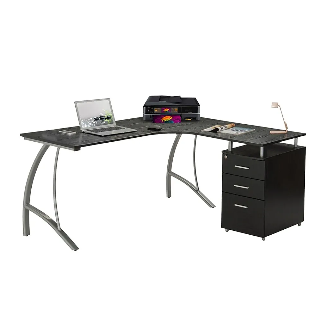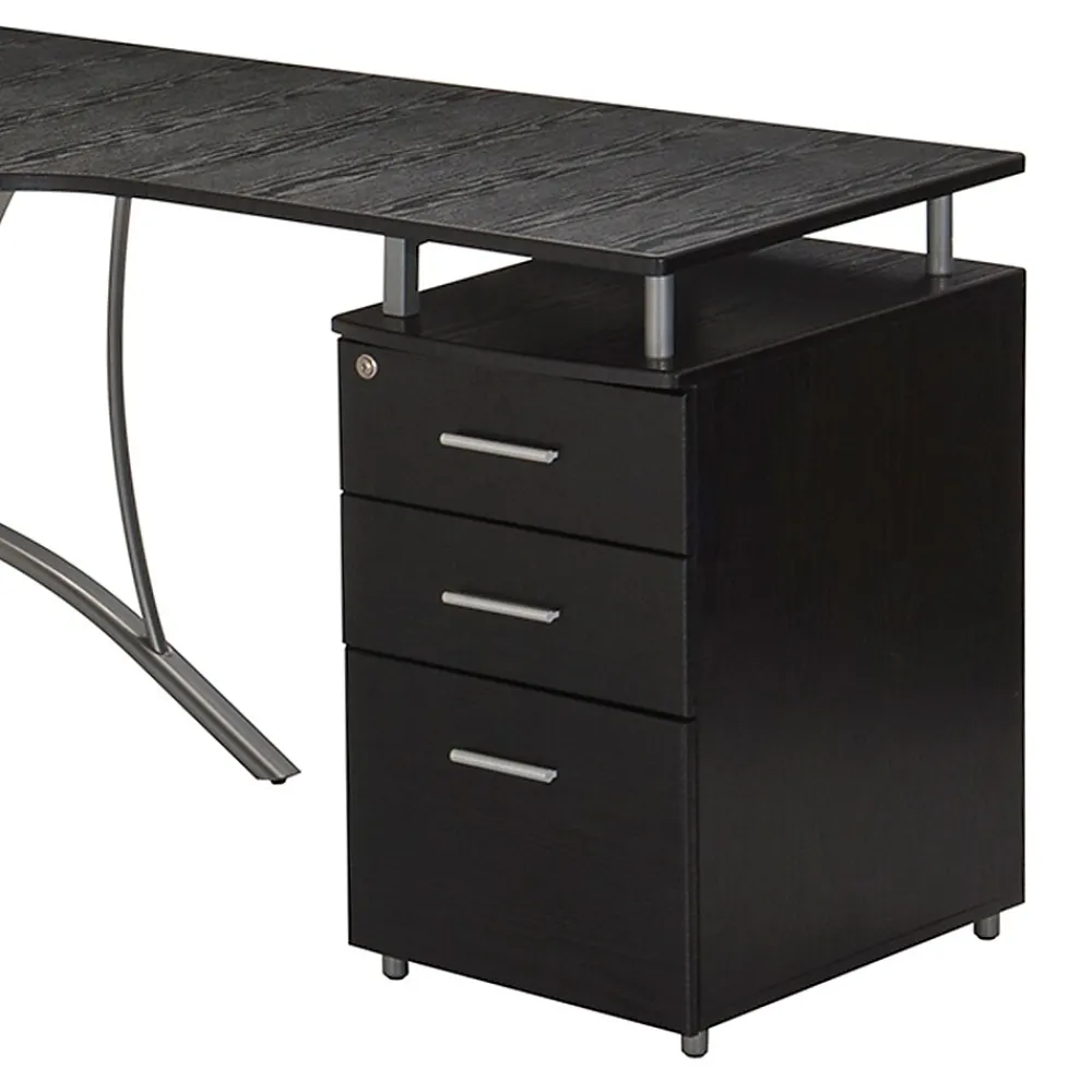 This modern Techni Mobili L-Shaped Computer Desk features a spacious desktop in a curved boomerang shape with a built-in locking storage cabinet and a hanging file cabinet. Curved legs are made of scratch-resistant powder-coated steel, while desktop and storage cabinet are made of heavy-duty engineered wood panels with PVC laminate surface. Color: Espresso