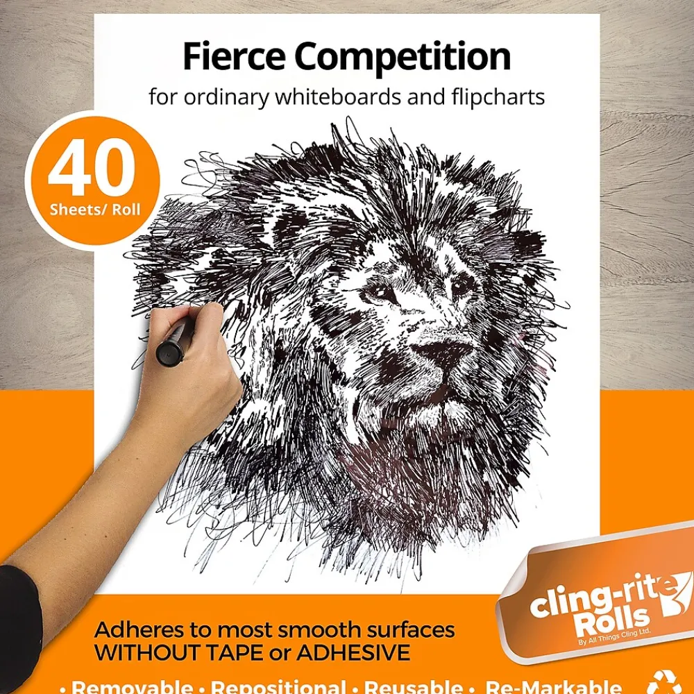 Includes 40 white dry erase sheets on a 100 foot roll. Each perforated Cling-rite® Roll sheet is 20 x 30 inches. Cling dry erase sheets to most indoor smooth surfaces. They are repositionable, erasable, recyclable and remarkable. Can be used as a temporary dry erase board. Reuse with dry erase or low odor markers, or use other markers or acrylic paint for single use. Will not harm surfaces. Cling lightweight paper onto the surface for storyboarding, or under it for tracing images, no tape or adhesive required. Perfect for the home office, distance learning, home school, and art projects. Cling-rite® is safe and easy to use. Cling-rite® sheets are reusable and very easy to move from one location to another. No adhesives, will not leave residue.