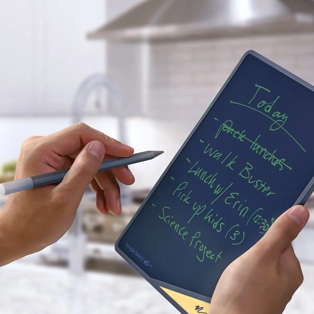 The VersaBoard reusable writing tablet is perfect for writing down household reminders, grocery lists, or family messages and is great alternative to paper notepads or dry erase boards. It’s an ideal size for hanging on your refrigerator using the included magnets, but can also live on its own, standing upright on any tabletop with the built-in kickstand that can be displayed in portrait or landscape. The new VersaPencil stylus allows you to be intentional when erasing. Tap the eraser end of the stylus to the corner of your board, unlocking Boogie Board’s QuickClear technology. The built-in magnets on the sides of the board and pencil slot allow the VersaPencil to attach to almost any side of the writing tablet, so it’s not easily lost.