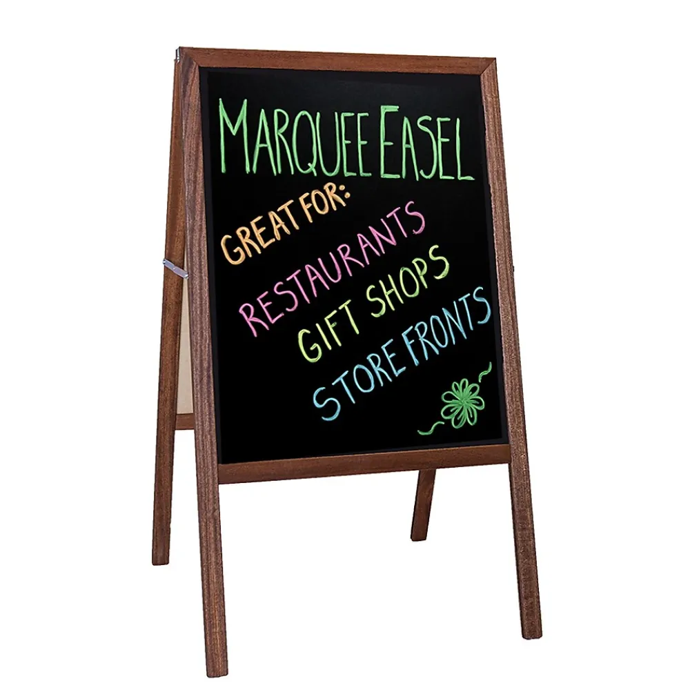 Wood Framed Black Dry Erase Marquee Board is two sided. Also known as a signage or sidewalk easel. Easels fold flat for easy storage. Measures 42″ H x 24″ W. Produced in the U.S.A.